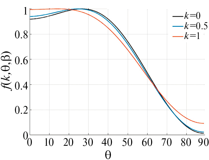 Рис. 4. Зависимость нормированного функционала при = 0°от угла для различных значений параметра k.