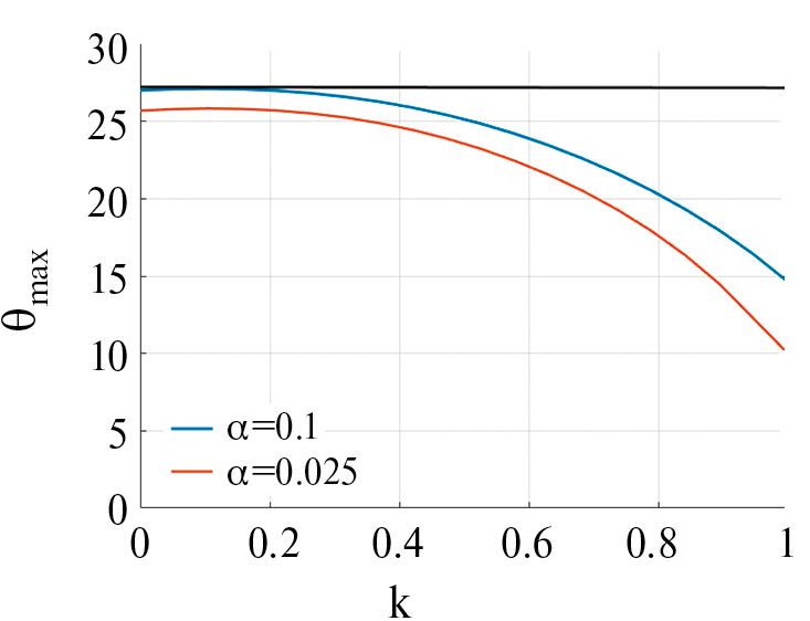 Рис. 5. Зависимость угла max, доставляющего максимальное значение функционалу, от параметра k для двух значений параметра поврежденности (черная линия соответствует углу Кулона–Мора).