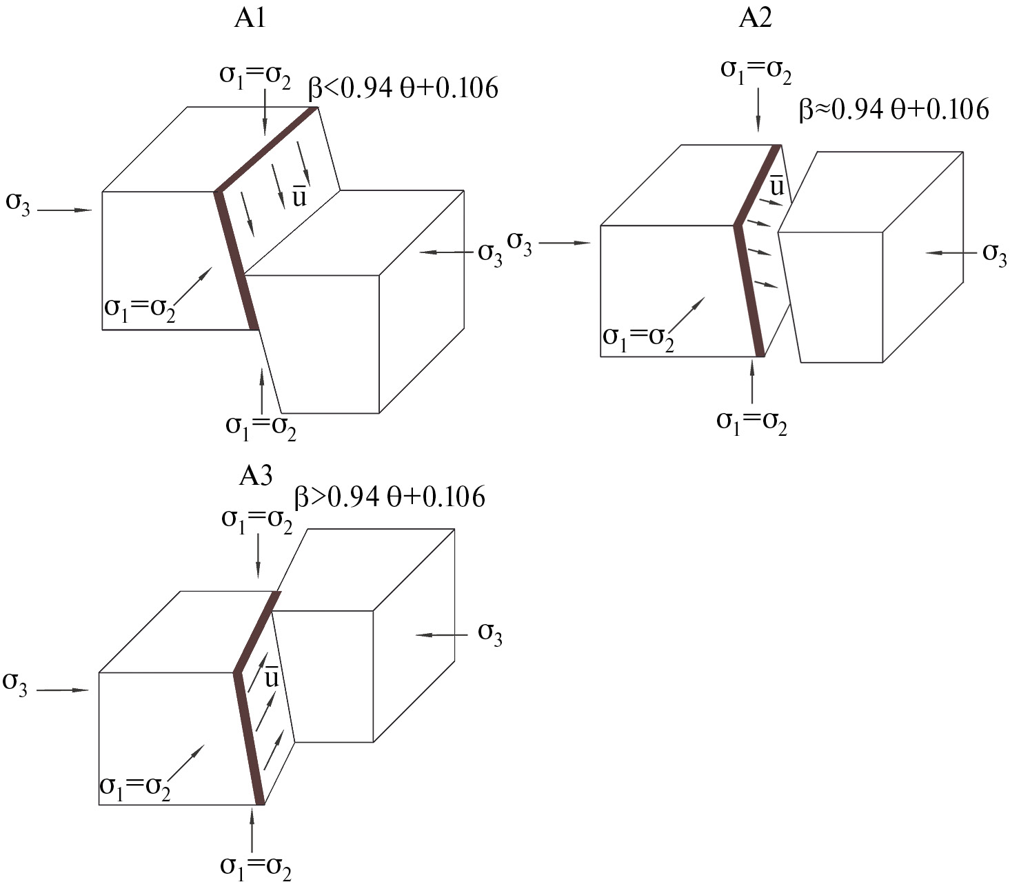Направление подвижки в этом случае зависит от соотношения величины углов . Так при < 0.94q + 0.106 имеет место сбросовый режим смещения блоков по плоскости зоны локализованной поврежденности, характеризующийся вертикальным сдвигом одного блока относительно другого (рис. 8, A1). В случае ≈ 0.94q + 0.106, характеризующимся, с одной стороны, малыми значениями угла (квазивертикальная ориентация зоны в плоскости XZ), а с другой стороны, большими значениями угла (выход зоны из плоскости YZ), будет наблюдаться горизонтальный сдвиг одного блока относительного другого (рис. 8, A3). В свою очередь, при ≈ 0.94q + 0.106 будет иметь место промежуточный смешанный сбросово-сдвиговой режим смещения блоков относительно друг друга (рис. 8, A2). В случаях A2 и A3 направление горизонтального сдвига (правый или левый сдвиг) будет определяться взаимной ориентацией зоны локализованной поврежденности и направлением действия промежуточного главного напряжения ( > 0 – левый сдвиг, < 0 – правый сдвиг). Соответственно, на рис. 8 (случай A3) представлен левый сдвиг.