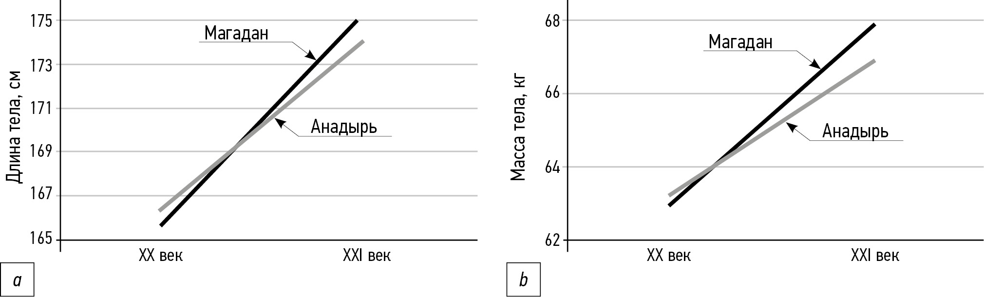 Рис. 1. Динамика соматометрических показателей юношей-аборигенов различных этнических групп из разных субъектов Дальневосточного региона — Магадана (коряки и эвены), Анадыря (чукчи): a — длина тела; b — масса тела.