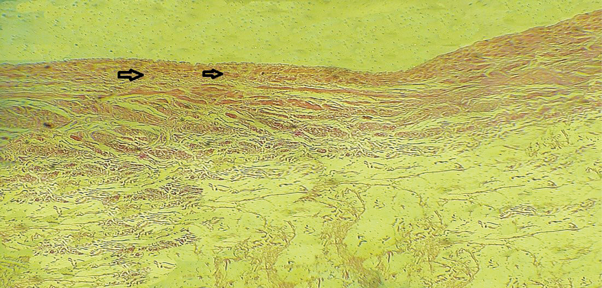При гистологическом изучении препаратов юношей 18–21 года на протяжении ствола ВВП отмечалась сходная патоморфологическая картина изменений всех слоёв сосудистой стенки. Слои сосудов хорошо различимы. Интима неравномерно утолщена за счёт соединительной ткани и часто содержит тонкие пучки мышечных волокон, толщина которых в начальной и средней части вены одинакова (58,1±4,1 и 58,3±4,7 мкм соответственно). В конечном отделе вены толщина мышечного слоя составила в среднем 48,95±4,20 мкм.