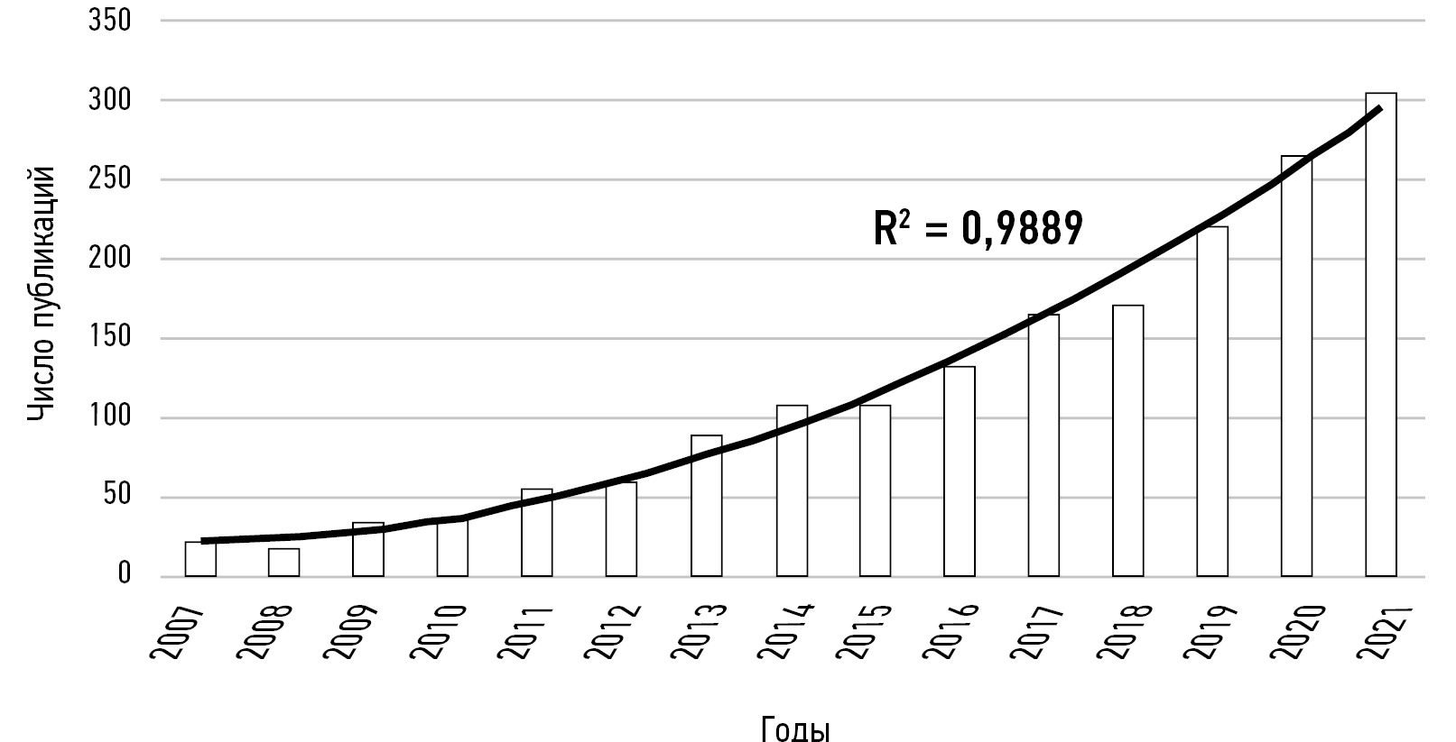 Интерес научного сообщества к исследованиям компонентного состава тела постоянно возрастает на протяжении последних десятилетий. На рис. 1 представлена динамика выхода научно-исследовательских работ, связанных с изучением состава тела, за последние 15 лет. Поиск проводили в базе данных PubMed по словосочетанию «состав тела» (body composition) в названиях и аннотациях статей. Представленная динамика свидетельствует о том, что каждый следующий год общее количество публикаций по составу тела возрастает в квадратичной зависимости, в среднем на 24% по отношению к показателям предыдущего.