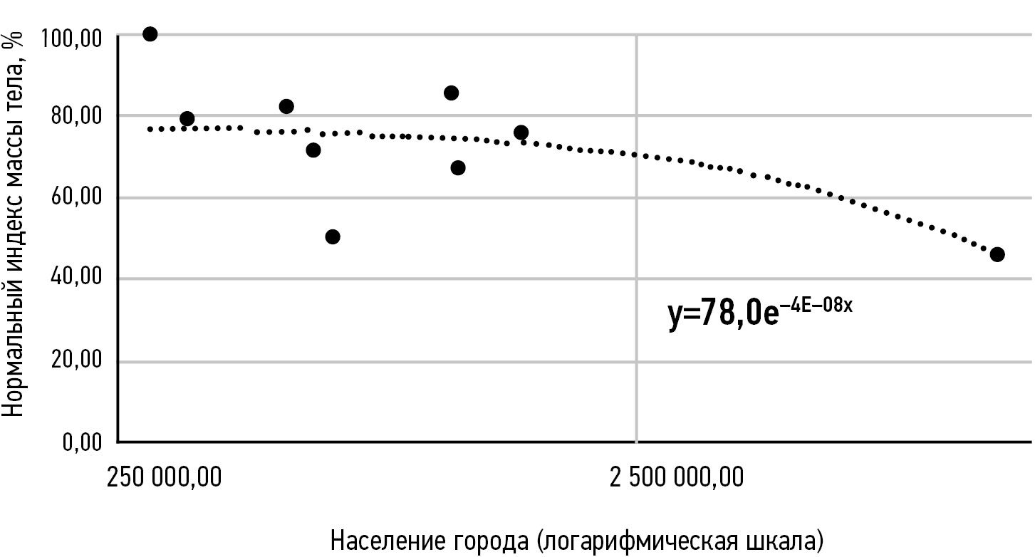 Рис. 2. Зависимость доли студентов с нормальным индексом массы тела от численности населения города, в котором расположен медицинский вуз. / Fig. 2. Dependence of the proportion of students with normal body mass index on the population of the city where the medical university is located.