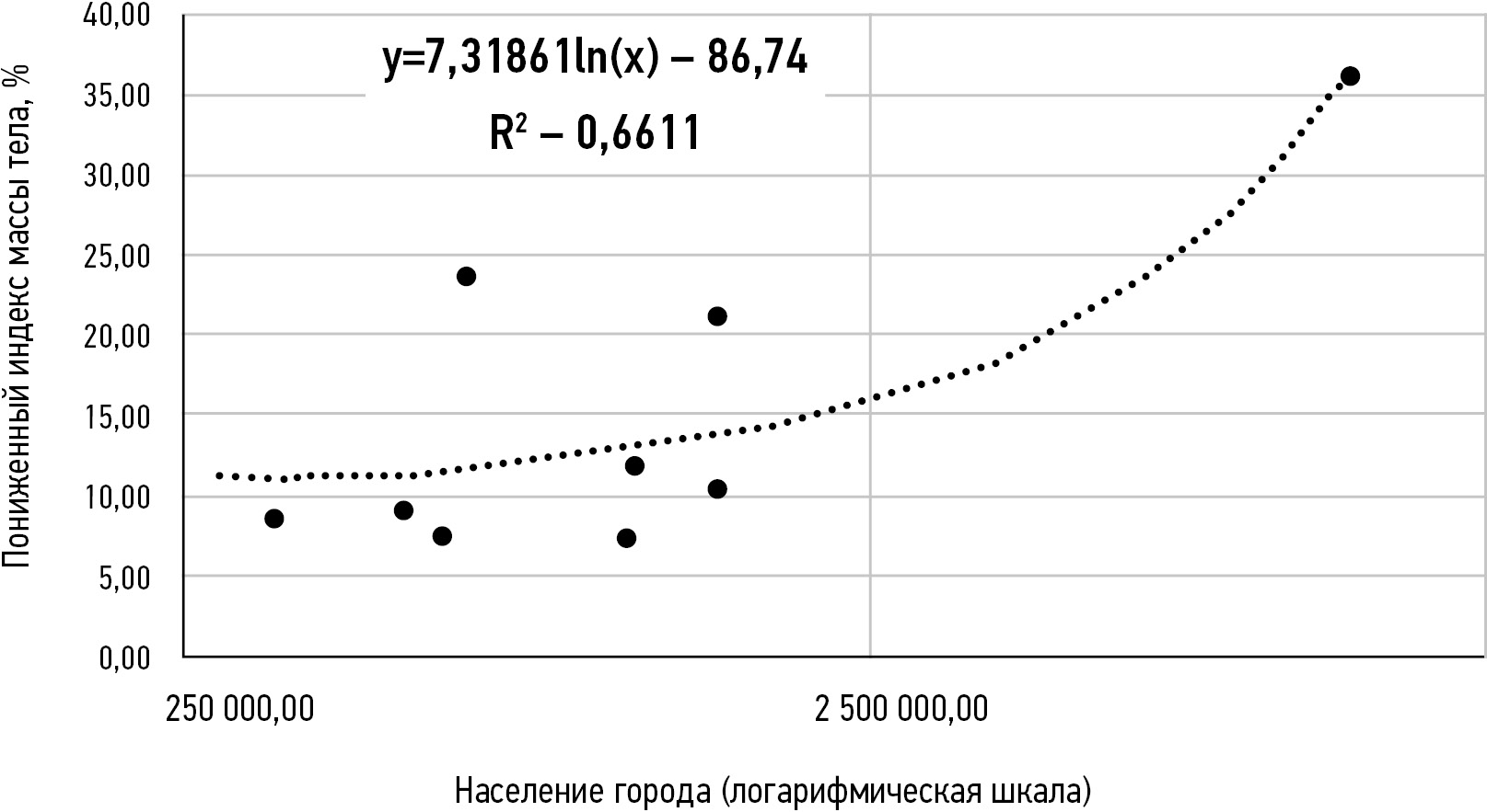 Рис. 3. Зависимость доли студентов с пониженным индексом массы тела от численности населения города, в котором расположен медицинский вуз. / Fig. 3. Dependence of the proportion of students with a reduced body mass index on the population of the city in which the medical university is located.