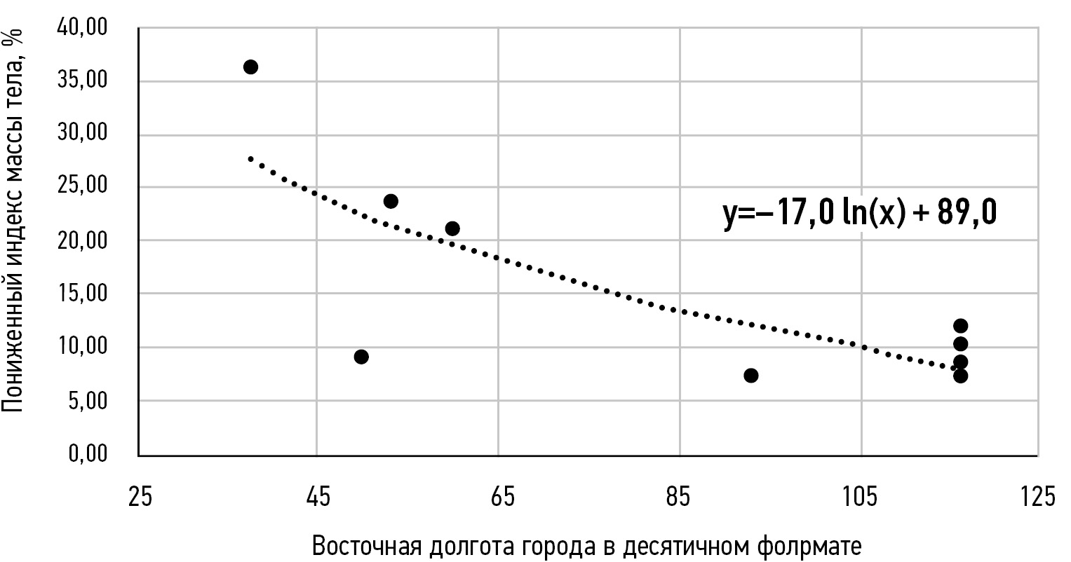 На рис. 3 и 4 продемонстрирована положительная логарифмическая связь средней силы между ростом доли студентов с пониженным ИМТ и увеличением численности населения города и обратная отрицательная связь по мере движения в направлении востока Российской Федерации, вплоть до Красноярска. Кроме того, рис. 2 демонстрирует снижение доли студентов с нормальным ИМТ по мере роста населения города, в котором расположен медицинский вуз.