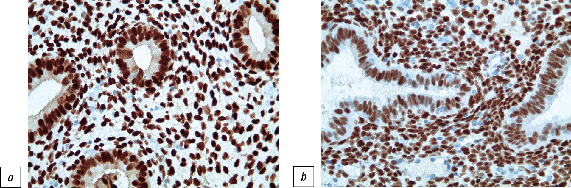 Рис. 4. Иммуногистохимическая экспрессия PR в ткани гиперплазии эндометрия без атипии исходно в группе с эффективной терапией (а), неэффективной терапией (b) (ИГХ, ×400).