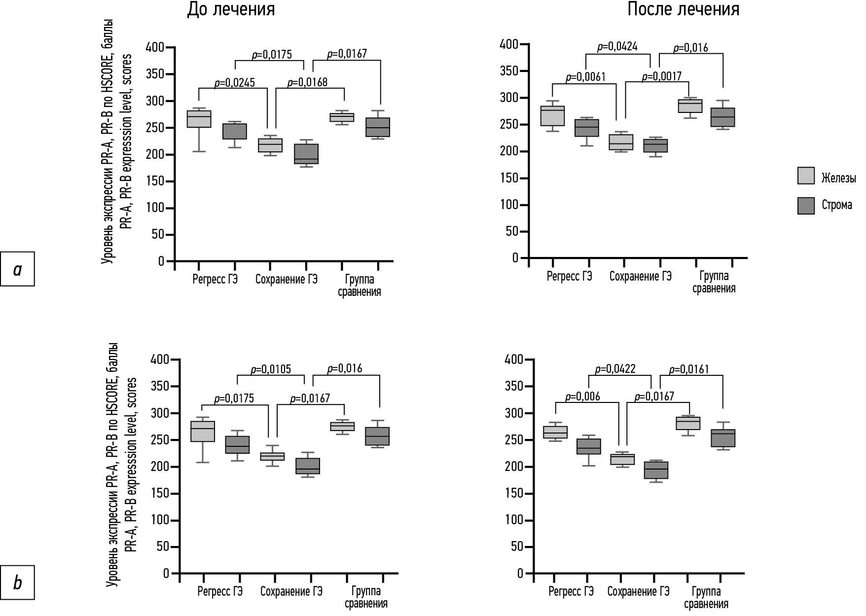 Рис. 3. Уровень иммуногистохимической экспрессии к рецепторам прогестерона в стромальных и железистых компартментах эндометрия у пациенток репродуктивного возраста с гиперплазией эндометрия (ГЭ) без атипии и аномальным маточным кровотечением: а — дидрогестерон (группа 1); b — норэтистерона ацетат (группа 2).