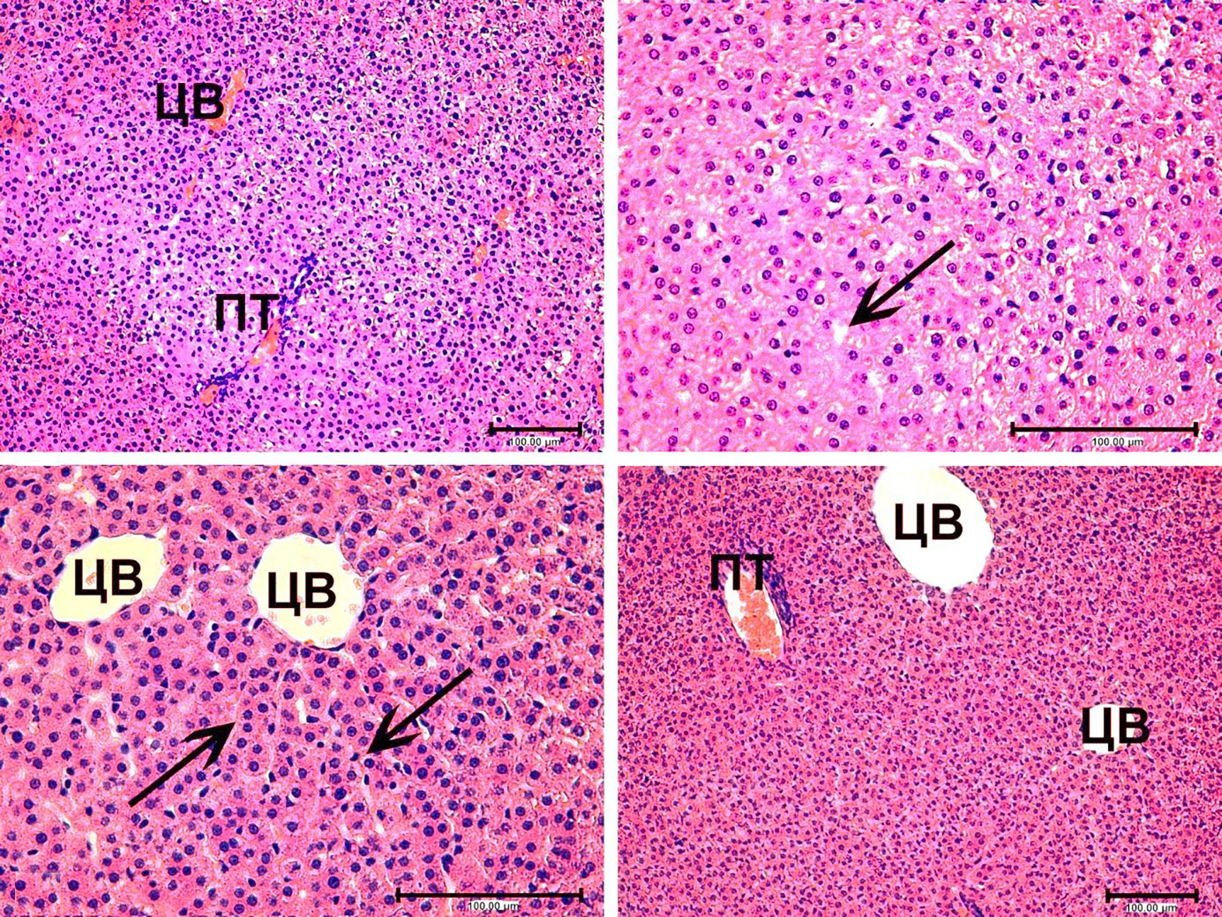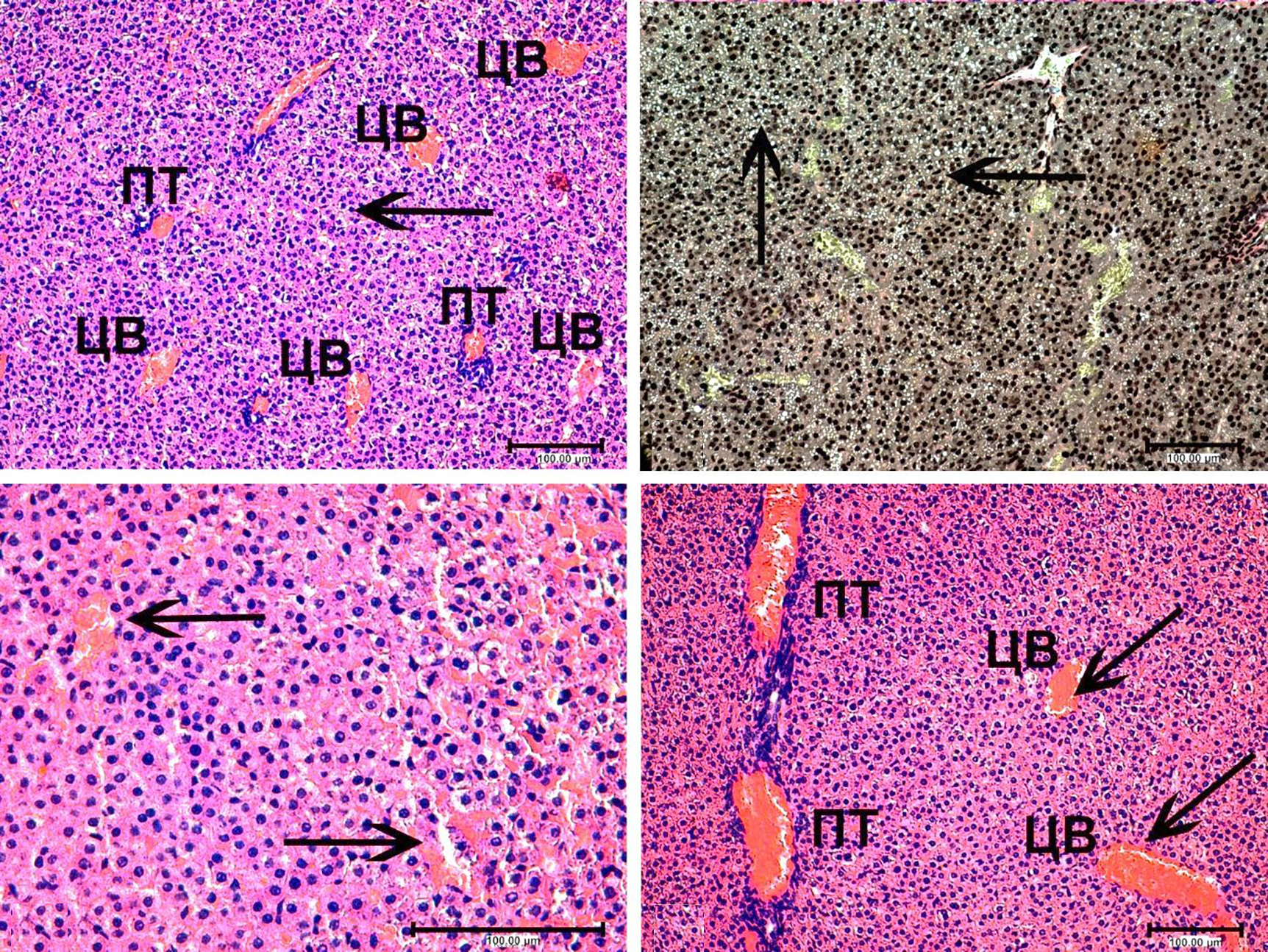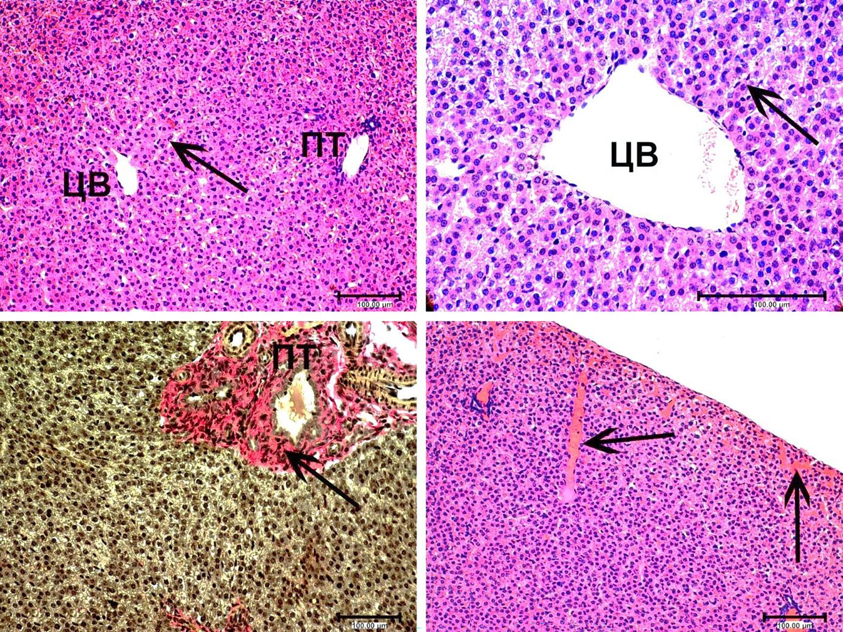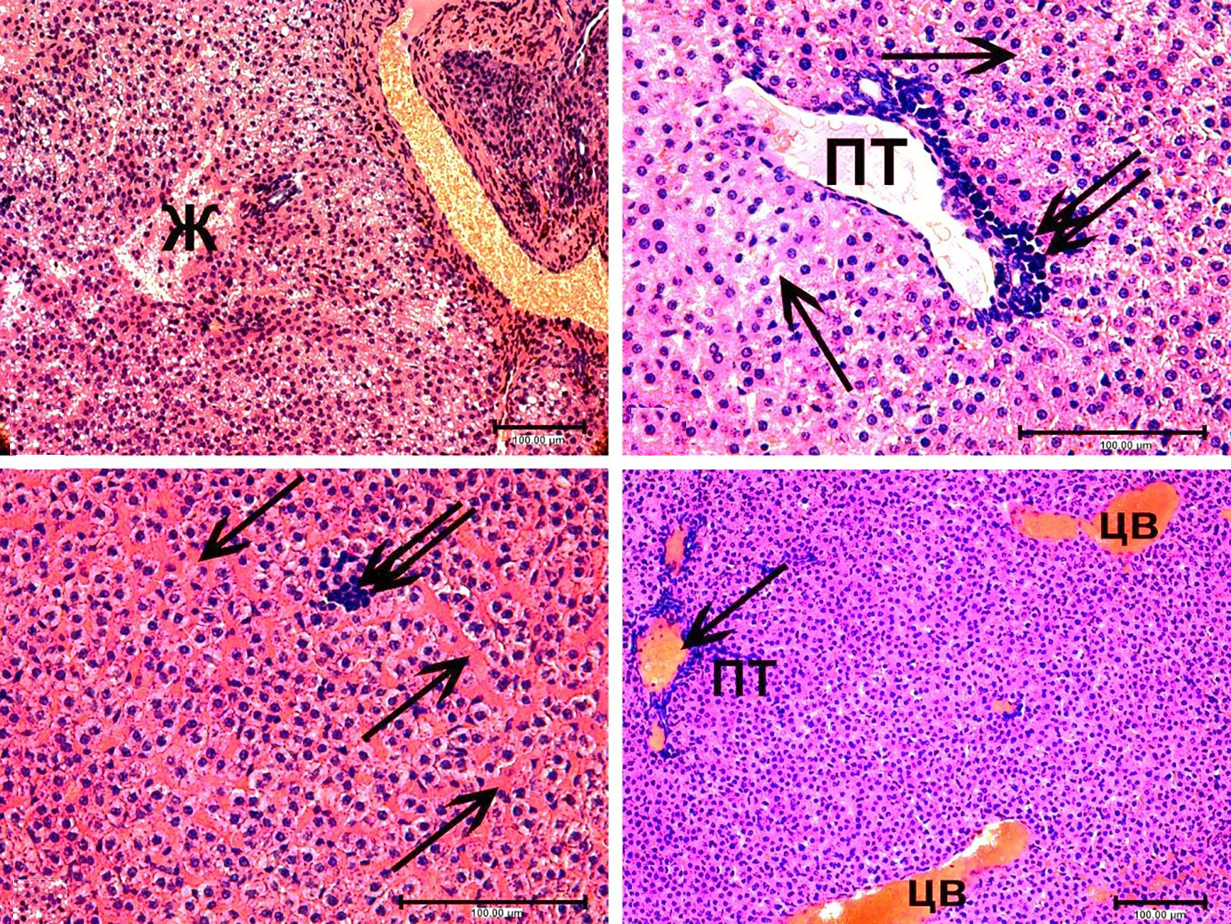 Fig 1. The structure of the liver of a rat in the control group, stained with hematoxylin and eosin: a — in the area of the portal tract — vacuolization of hepatocytes, loss of the trabecular structure of the parenchyma; ×100; b — in the area of the portal tract — dystrophic changes in hepatocytes (↑), macrophage infiltration (↑↑), loss of the trabecular structure of the parenchyma; ×200; c — cellular infiltrates (↑), hemostasis in dilated sinusoids (↑↑), loss of the trabecular structure of the parenchyma; ×200; d — hemostasis in the central veins and vessels of the portal tracts (↑); ×100. Here: ПТ — portal tract, Ж — area of fatty degeneration, ЦВ — central veins.