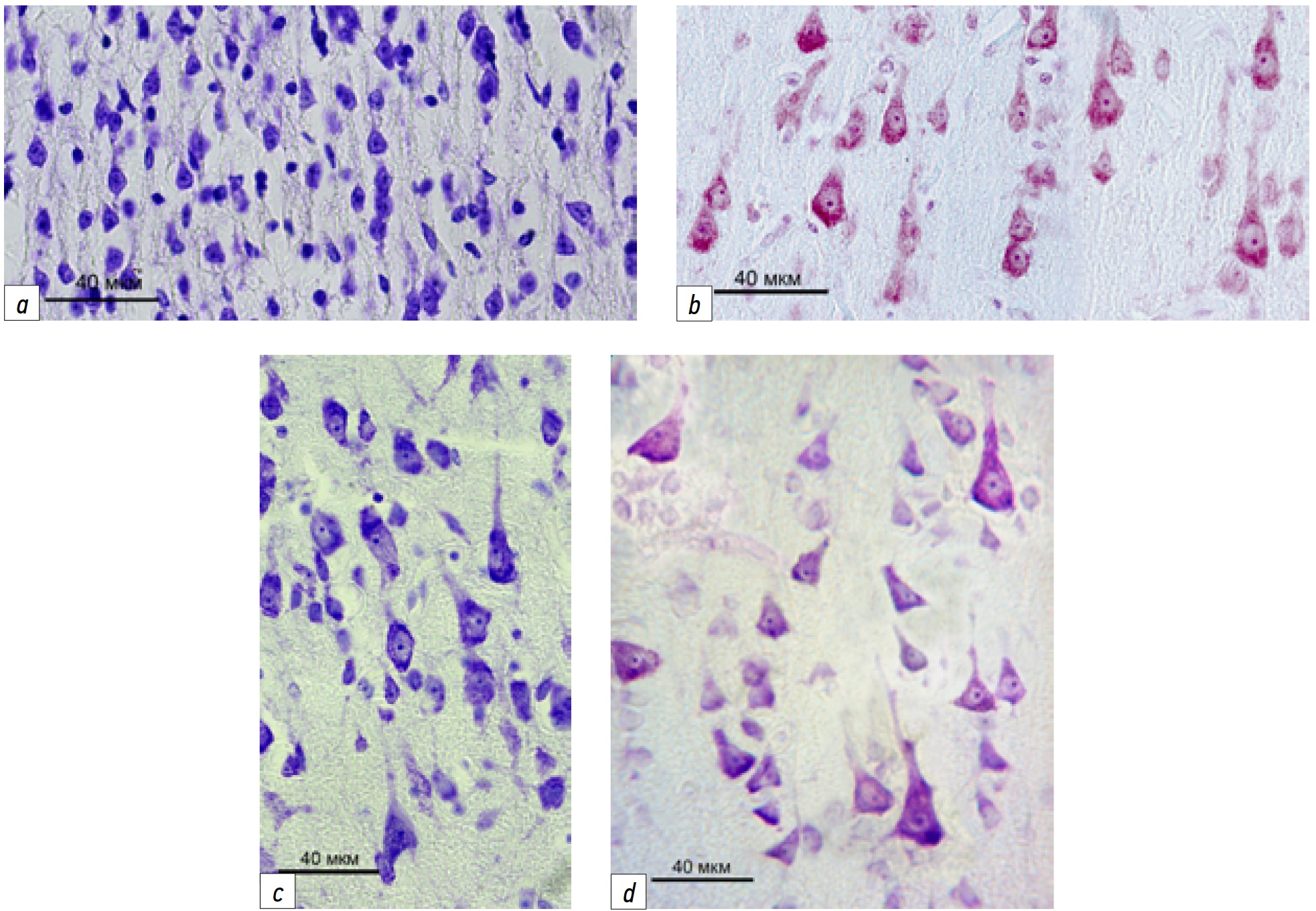 Fig. 1. Neuroarchitectonics of sublayer III3 of the temporoparietal-occipital subarea of the cerebral cortex in children: a — newborn, subarea 37d; b — 12 months, subarea 37d; c — 3 years, subarea 37as; d — 10 years, subarea 37a. The differentiation and increase of the profile field area of pyramidal neurons with age is shown. Nissl staining with cresyl violet. Magnification 40×10.