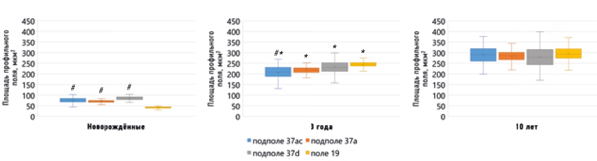 Рис. 2. Возрастные и межгрупповые различия площади профильных полей пирамидных нейронов в подслое III3 в различных зонах задней ассоциативной коры у детей; # различия статистически значимы по сравнению с аналогичным показателем в поле 19 в той же возрастной группе при p <0,03; * по сравнению с новорождёнными при р <0,001.