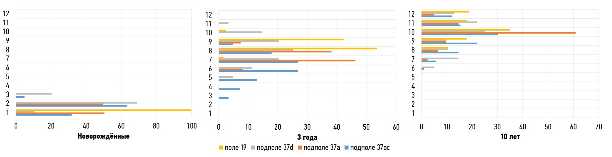 Fig. 3. Age and group differences in area of profile fields of pyramidal neurons in sublayer III3 in different areas of the posterior associative cortex in children. On the abscissa axis — relative content of pyramidal neurons (%); on the ordinate axis — size classes: 1 — up to 70 μm2, 2 — from 70.1 to 95.0 μm2, 3 — from 95.1 to 120.0 μm2, 4 — from 120.1 to 145.0 μm2, 5 — from 145.1 to 170.0 μm2, 6 — from 170.1 to 195.0 μm2, 7 — from 195.1 to 220.0 μm2, 8 — from 220.1 to 245.0 μm2, 9 — from 245.1 to 270.0 μm2, 10 — from 270.1 to 295.0 μm2, 11 — from 295.1 to 320.0 μm2, 12 — more than 320.1 μm2.