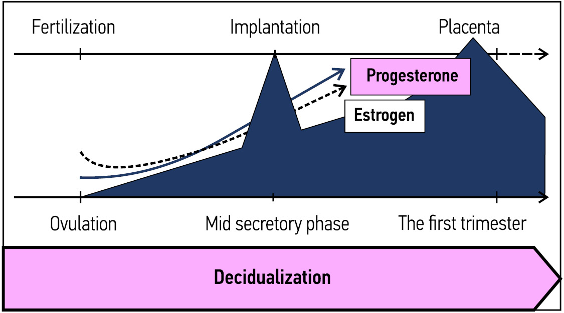 In the proliferative (follicular) phase of the menstrual cycle, estradiol stimulates the transcription of the progesterone receptor in endometrial cells, ensuring their sensitivity to progesterone in the secretory phase [1, 3]. Following ovulation, estrogen-dependent proliferation during the follicular phase controls the division of endometrial epithelial and stromal cells into subpopulations with different functions and responses to decidual stimuli [2, 4, 5]. After ovulation, an increase in progesterone provokes the onset of decidualization, and its high level is maintained throughout pregnancy [6]. Progesterone is an important signal of decidualization and a prerequisite for successful implantation. The dynamics of the ovarian secretion of estradiol and progesterone in the menstrual cycle control decidualization and implantation [6, 7]. Postovulatory progesterone deficiency is associated with infertility and recurrent miscarriages [8].
