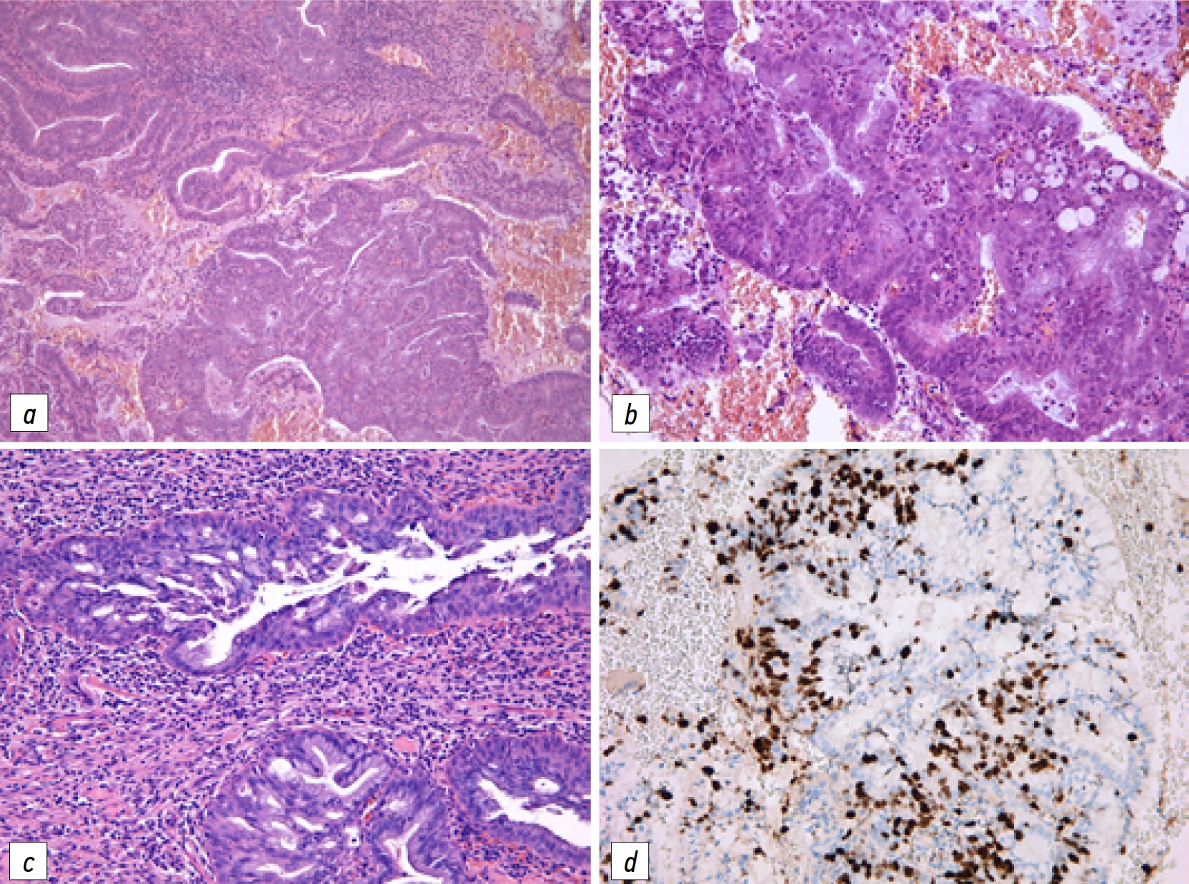 Рис. 1. Эндометриоидная аденокарцинома с участками микрожелезистого строения (a), окраска гематоксилином и эозином, ×100: в верхнем поле — эндометриоидная аденокарцинома типичного строения, в нижнем поле — микрожелезистоподобный вариант строения с обильной инфильтрацией эозинофильными лейкоцитами; b — микрожелезистоподобный вариант строения аденокарциномы с инфильтрацией стромы пенистыми макрофагами, окраска гематоксилином и эозином, ×200; c — микрожелезистая гиперплазия эндоцервикса, окраска гематоксилином и эозином, ×200; d — иммуногистохимическое исследование с Ki-67, ×200: очаговая ядерная экспрессия Ki-67 (около 50%) в участке микрожелезистоподобного строения карциномы эндометрия.