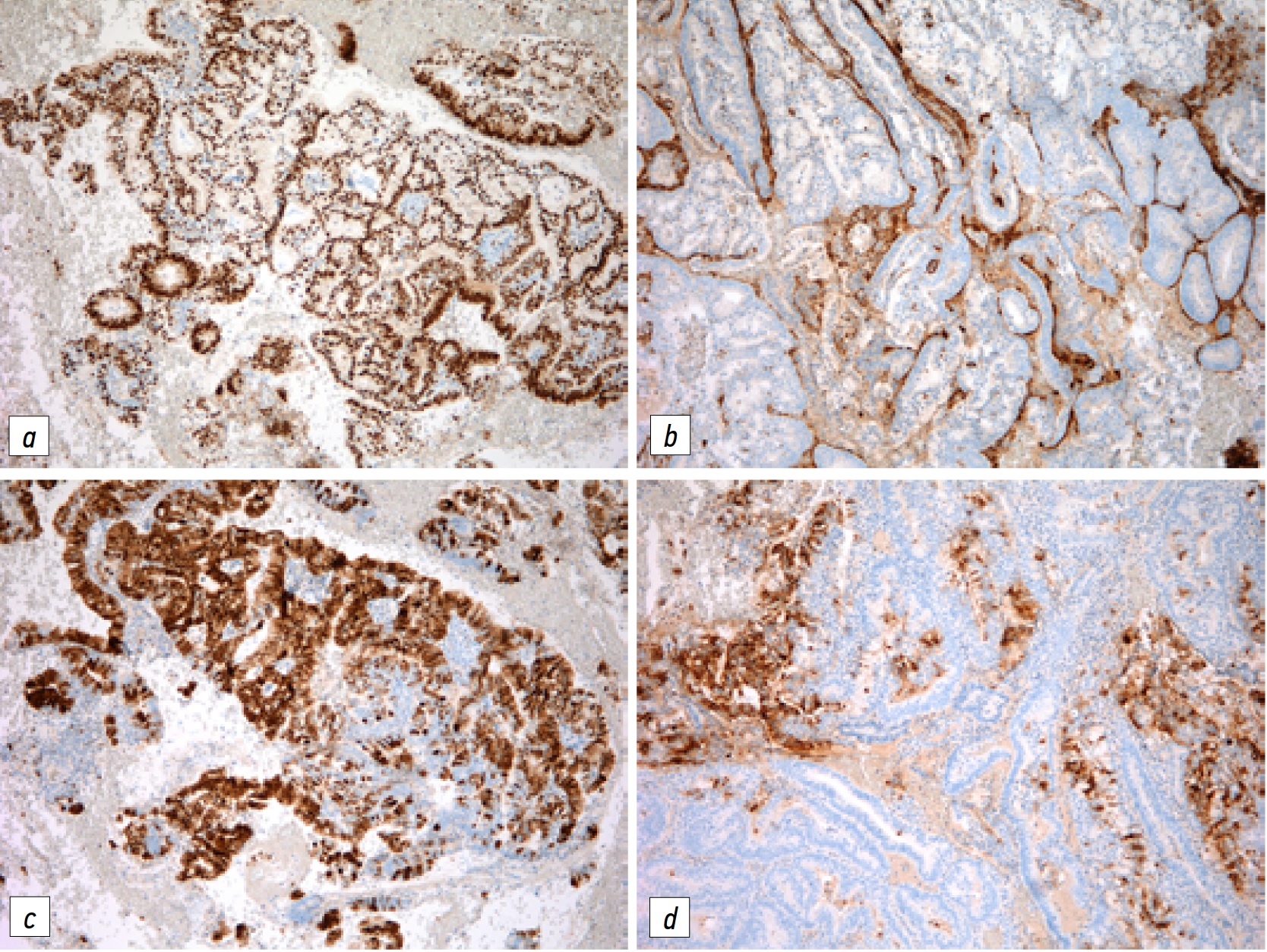 Рис. 2. Иммуногистохимическое исследование с ER (a), ×100: диффузная ядерная экспрессия ER, в том числе в участках микрожелезистоподобного строения; b — иммуногистохимическое исследование с CD10, ×100: стромальное окрашивание CD10 в опухоли, в том числе в участках микрожелезистоподобного типа строения; c — иммуногистохимическое исследование с p16, ×100: очаговое цитоплазматическое окрашивание p16 в участках микрожелезистоподобного строения; d — иммуногистохимическое исследование с CEA, ×100: очаговое цитоплазматическое окрашивание CEA, преимущественно в участках плоскоклеточной дифференцировки.