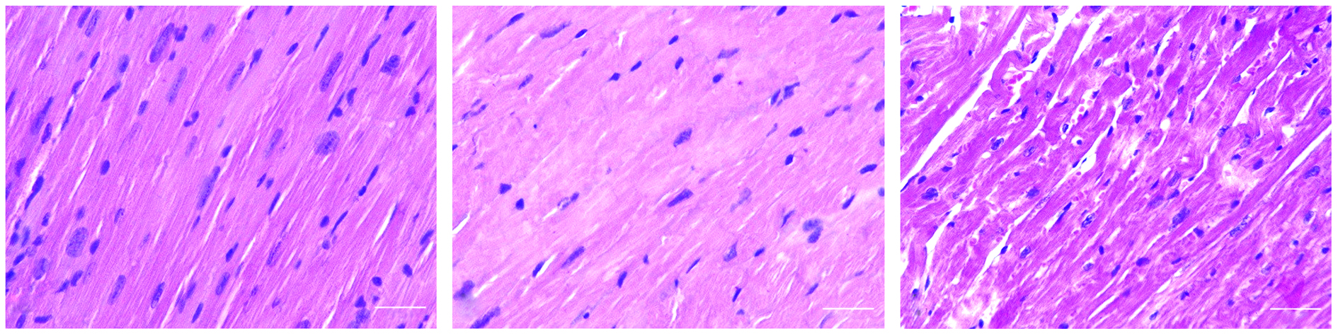 The cardiomyocytes were characterized by morphometric accounting of three parameters, namely, the distance between the intercalated discs (length), thickness, and perimeter of the nuclei (2D format in the AxioVision v. 4.9.1 program, USA).