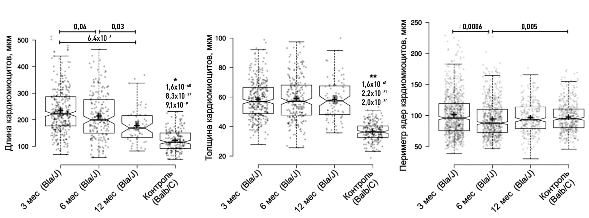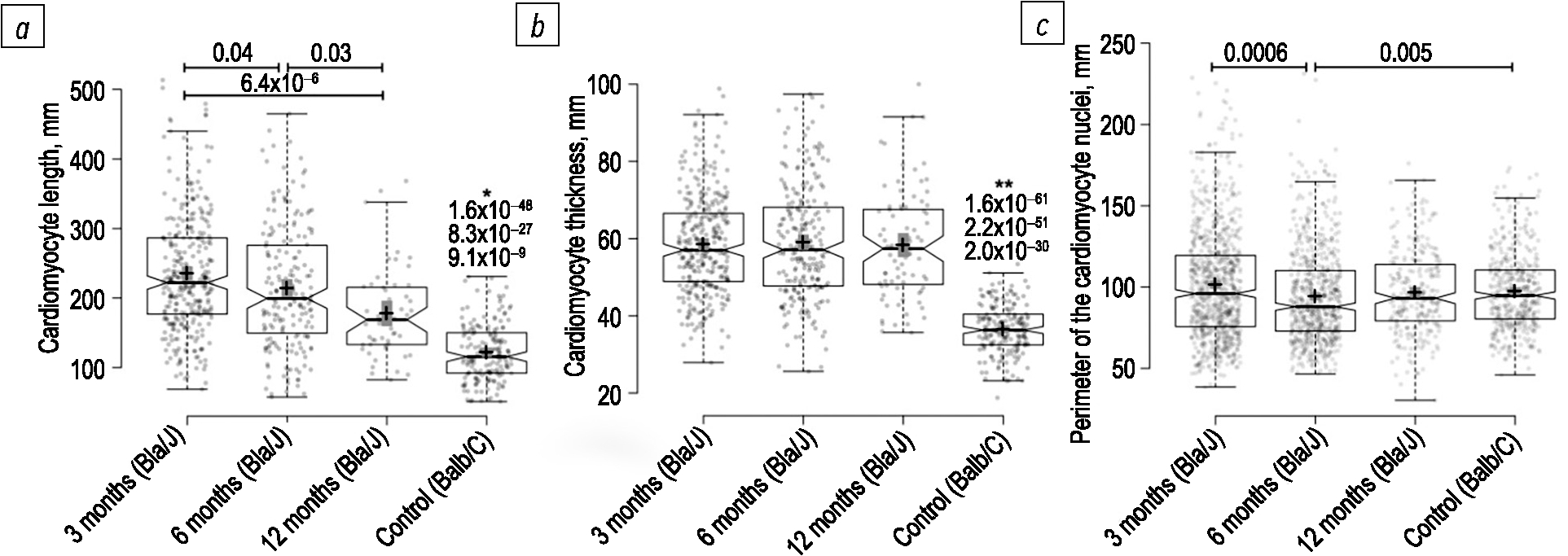 Fig. 2. Morphometric characteristics of cardiomyocytes in Bla/J and Balb/C mice: a — cardiomyocytes length; b — cardiomyocytes width (diameter); c — cardiomyocytes nucleus perimeter; * p-value in «cardiomyocytes length» comparison of every group of Bla/J mice with Balb/C mice, ** p-value in «cardiomyocytes width (diameter)» comparison of every group of Bla/J mice with Balb/C mice.