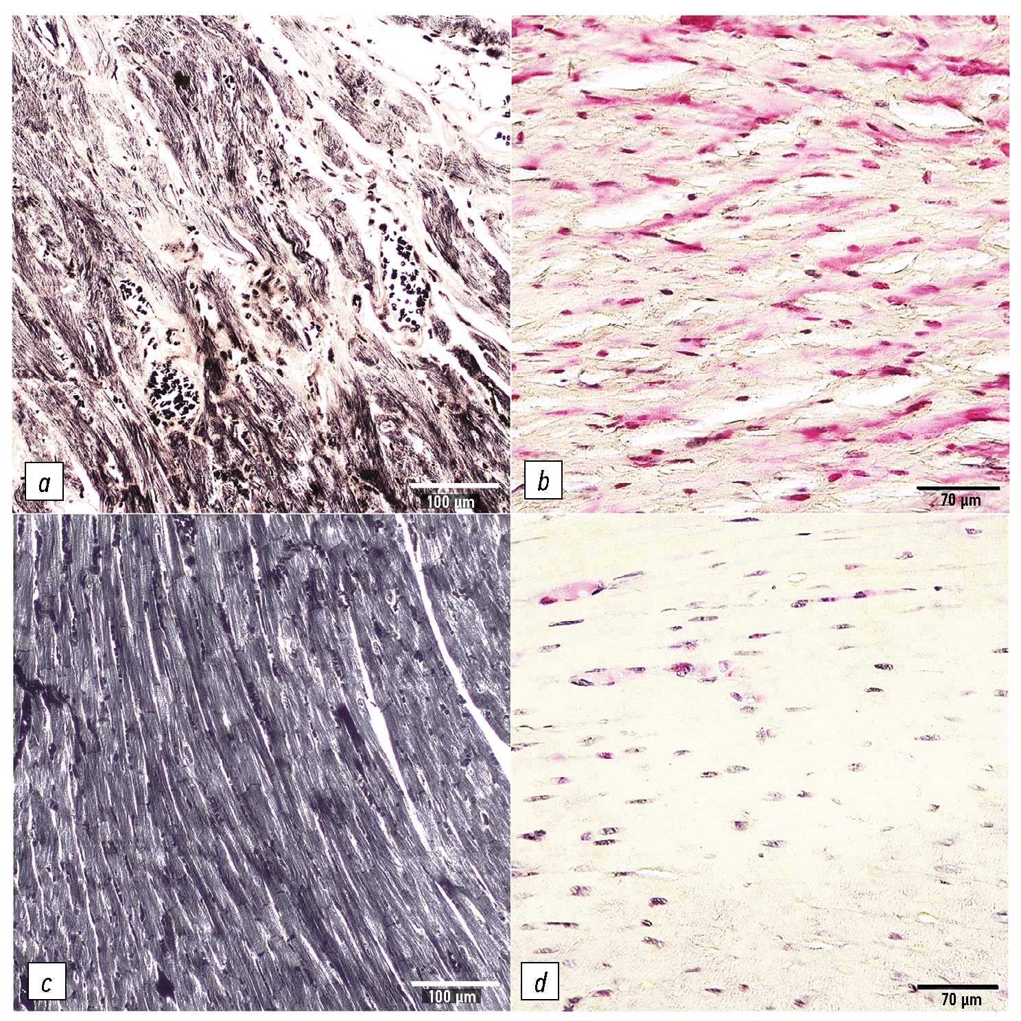 Fig. 3. Myocardium of Bla/J (a, b) and Balb/C (c, d) mice: a — 12 months old, intermuscular fibrosis; b — 6 months old, multiple fuchsinophilic insertions in cytoplasm; c — 6 months old, no fibrosis features; d — 6 months old, no fuchsinophilic insertions in cytoplasm. Iron hematoxylin dying (a, c); hematoxylin-basic fuchsin-picric acid dying (b, d); a, c — ×200; b, d — ×400.