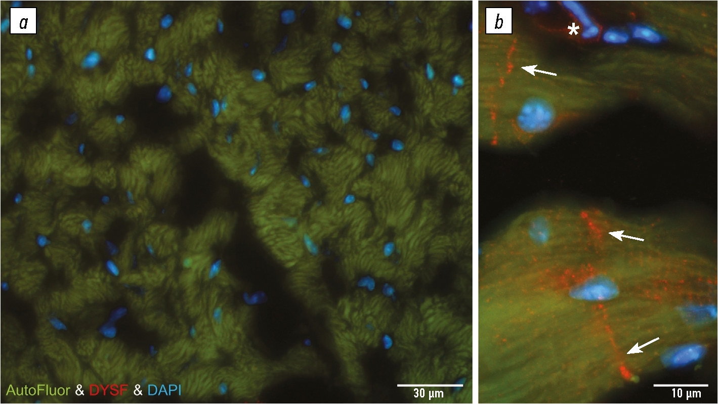 Dysferlinopathy is a hereditary progressive muscular dystrophy characterized by distal, proximal, proximodistal, and congenital variants of clinical phenotypes [1]. Its worldwide prevalence is 1 per 200,000 newborns [2, 3]. Inheritance is predominantly autosomal recessive; however, a dominant type has also been described [4, 5]. Dysferlinopathy is caused by mutations in DYSF, which are localized to the short arm of the second chromosome [4]. Dysferlin ensures the repair of the sarcolemma and endoplasmic reticulum of muscle fibers of striated skeletal muscles. However, the significance of this protein in the cyto- and histophysiology of cardiomyocytes has not been sufficiently studied.