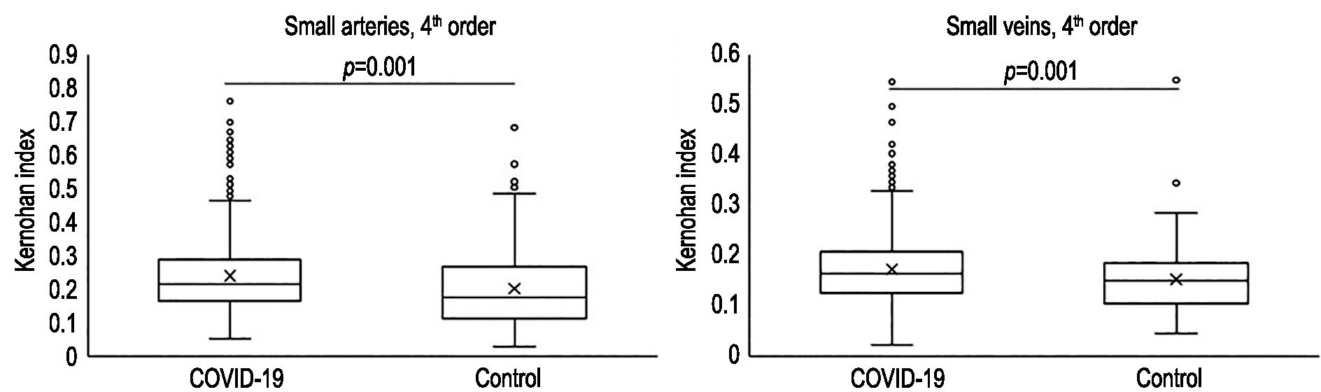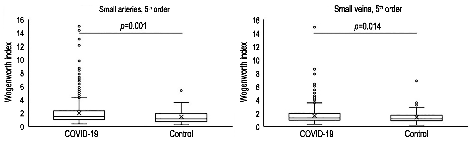 RESULTS: It was found that the proportion of thrombosed vessels in the lung tissues of the deceased was 27.6%. In 87.2% of cases, thrombosis develops in small arteries (lumen diameter 30-500 microns) and small veins (lumen diameter 40–500 microns). The vascular-functional indices of Kernogan and Vogenworth were statistically significantly increased in small arteries and small veins of the 4th order (p=0.001), small arteries (p=0.001) and small veins of the 5th order (p=0.014) compared with the control group.