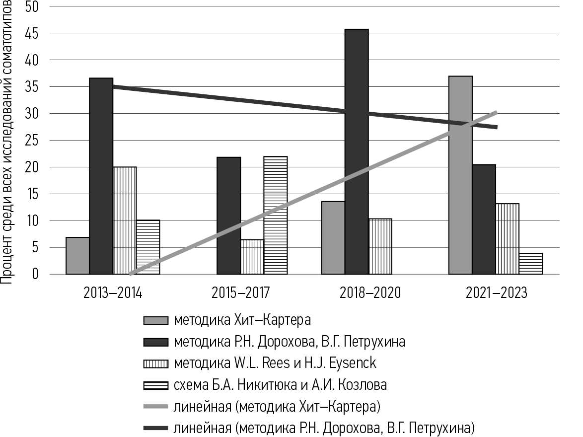 Среди оригинальных исследований было найдено 193 полнотекстовые статьи, содержащие прямые указания на методики соматотипирования. На основании полученных данных определяли использованную в работе схему соматотипирования и принадлежность работы к одному из пяти направлений: клинические аспекты соматотипирования, исследование обучающихся юношеского и первого зрелого возраста, соматотипирование женщин, спортивные аспекты соматотипирования, «другие» исследования. На основании полученных результатов строили графики. Для исследования динамики востребованности схем соматотипирования частόты их упоминаний рассчитаны отдельно для интервалов 2013–2014 гг., 2015–2017 гг., 2018–2020 гг., 2021–2023 гг. Все вычисления проводили с использованием электронных таблиц Excel.