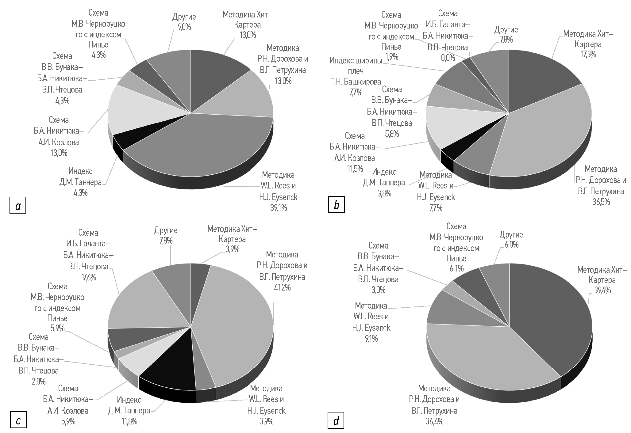 Обобщая данные рис. 4, можно заключить, что наиболее востребованными являются методика Р.Н. Дорохова и В.Г. Петрухина при исследовании юношеского и первого зрелого возраста и соматотипировании женщин, методика W.L. Rees и H.J. Eysenck — при клинических исследованиях, методика Хит–Картера — при исследовании спортсменов.