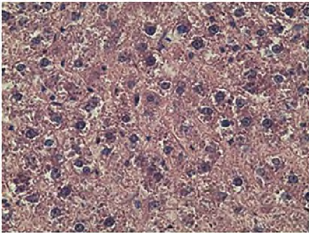 Анализ морфологической картины печени интактных крыс-самцов, служивших контролем, позволил установить её соответствие возрастной норме. В частности, нами обнаружена сохранная структура печёночных балок, состоящих из гепатоцитов полигональной формы, имеющих одно или два округлых ядра, которые расположены по центру клетки (рис. 1, a, b).