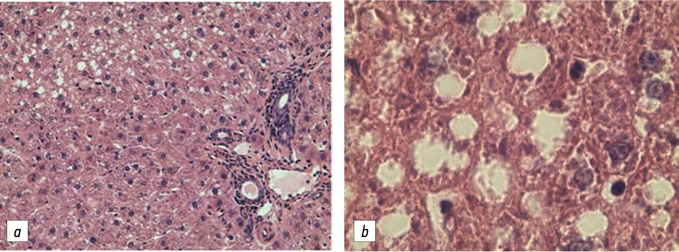 Рис. 1. Печень крыс 1-й группы (♂, контроль): a — ×200, b — ×400 [18]. Окраска гематоксилином и эозином.