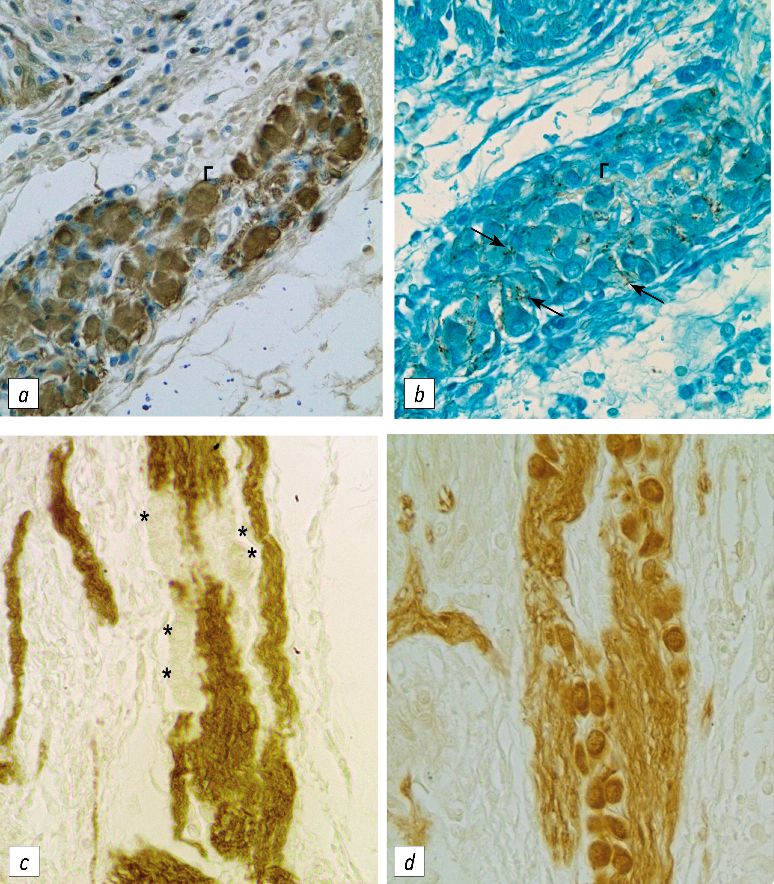 Рис. 2. Нервные структуры в средостении новорождённой крысы: ↑↑ — дифференцирующися синапсы преганглионарные волокна на TH–/PGP 9.5+ нейронах сердечного парасимпатического ганглия (Г); * TH-иммунонегативные нейроны в симпатическом нервном стволе. Иммуногистохимические реакции на белок PGP 9.5 (а, d), синаптофизин (b) и тирозингидроксилазу (c); ×400. TH — tyrosine hydroxylase (тирозингидроксилаза).