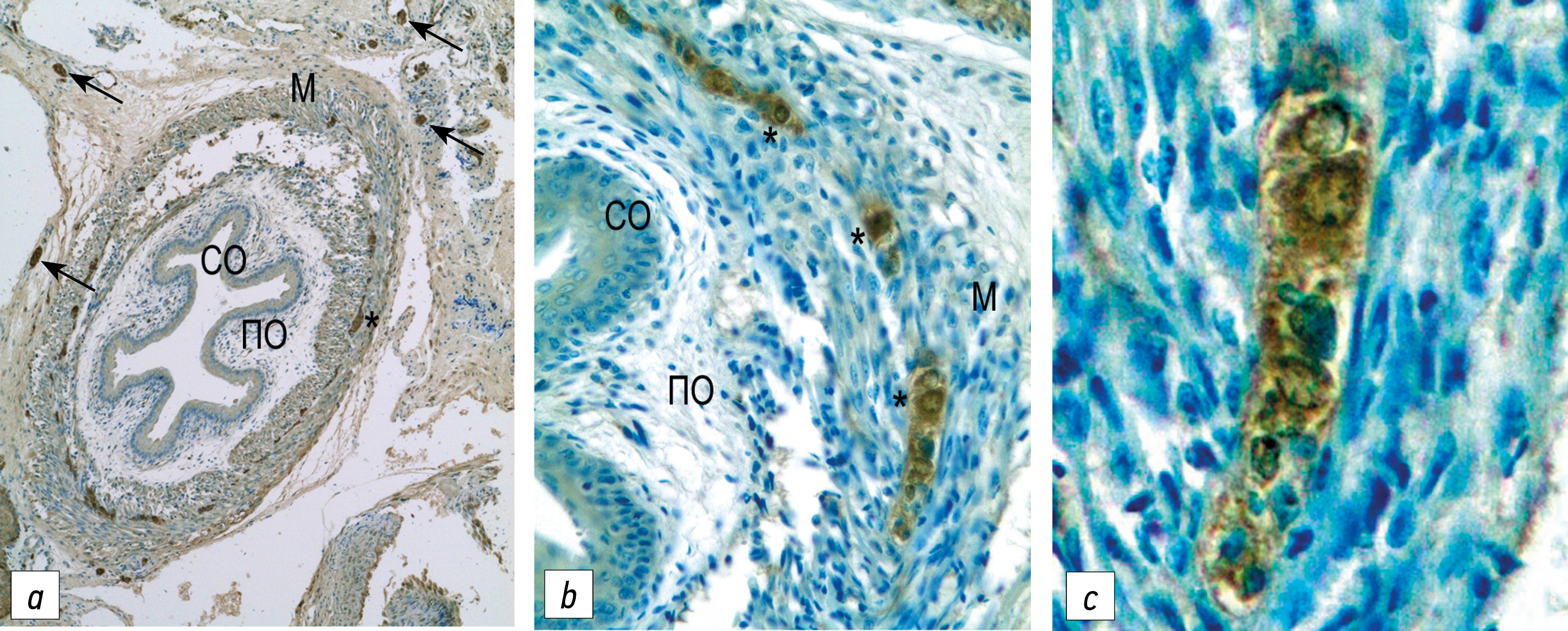 Рис. 3. Нервные структуры в стенке пищевода средостения новорождённой крысы: СО — слизистая оболочка, ПО — подслизистая основа, М — мышечная оболочка стенки пищевода; * ганглиозные нервные клетки Ауэрбахова сплетения; ↑↑ — пучки нервных волокон. Иммуногистохимическая реакция на белок PGP 9.5; ×40 (а), ×100 (b), ×400 (c).