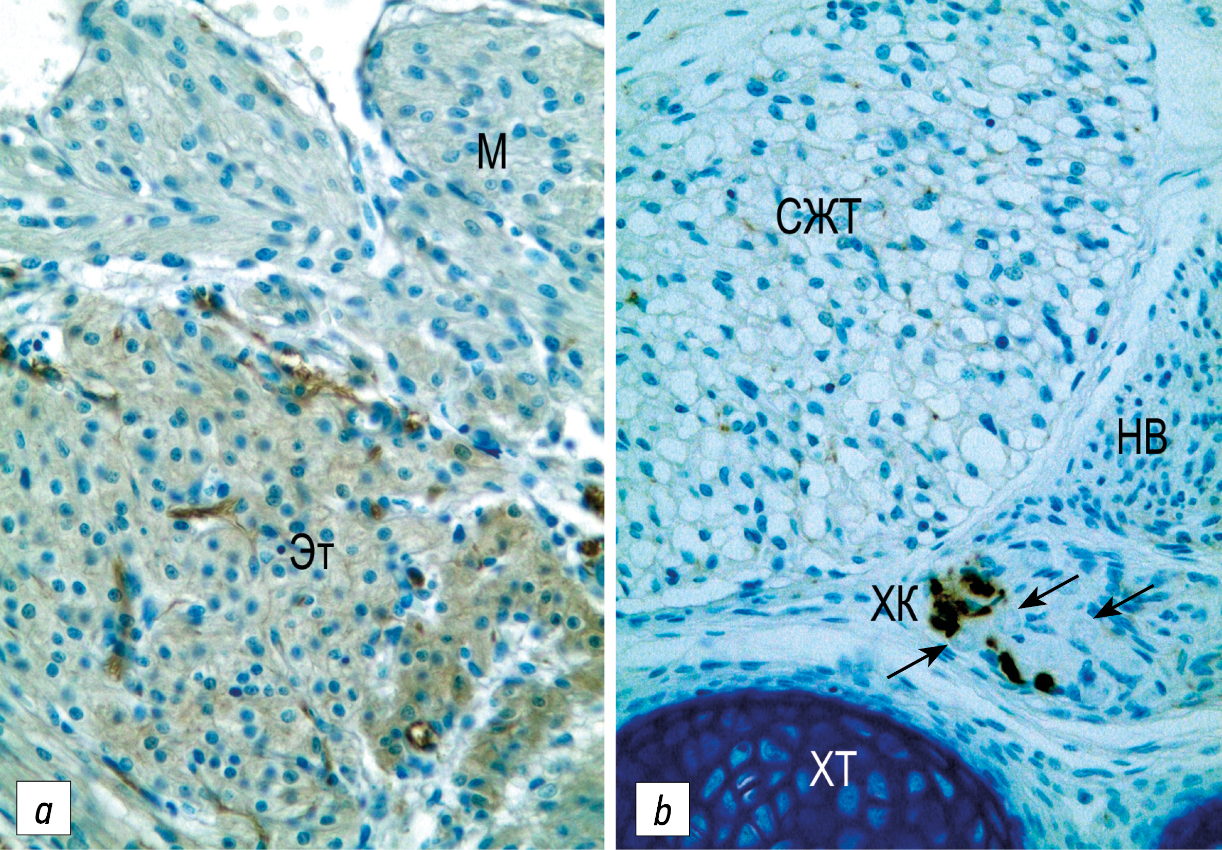 Рис. 4. Фрагменты жировой ткани средостения новорождённой крысы, отражающие разные стадии её функционального состояния и развития: а — эпителиальное тельце; b — долька смешанной жировой ткани, состоящая из бурых и белых адипоцитов. М — миокард предсердия, Эт — эпителиальное тельце, ХК — хромаффинные клетки, ↑↑ — ТН-иммунонегативные парасимпатические нейроны, НВ — нервные волокна вагусного нерва; СЖТ — долька смешанной жировой ткани, ХТ — хрящевая ткань. Иммуногистохимическая реакция на белок PGP 9.5 (а) и тирозингидроксилазу (b); подкраска толуидиновым синим; ×100.