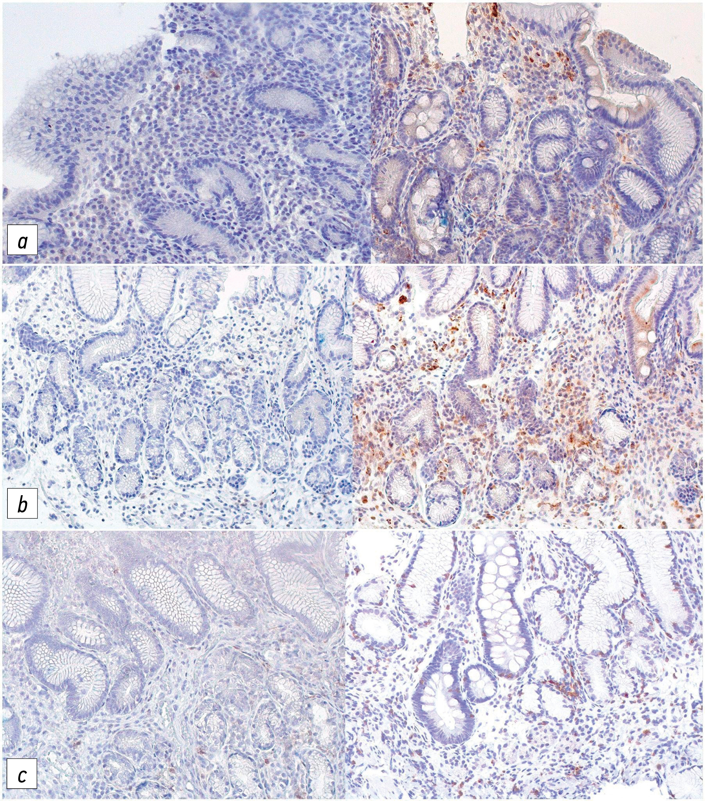 4. Fig. 3. Microphotographs of the gastric mucosa of patients with chronic atrophic gastritis without metaplasia — on the left, with intestinal metaplasia — on the right; ×200. Immunohistochemical study with primary antibodies to: a — CD68 (macrophages); b — CD8 (T-cytotoxic lymphocytes); c — CD138 (plasmocytes).