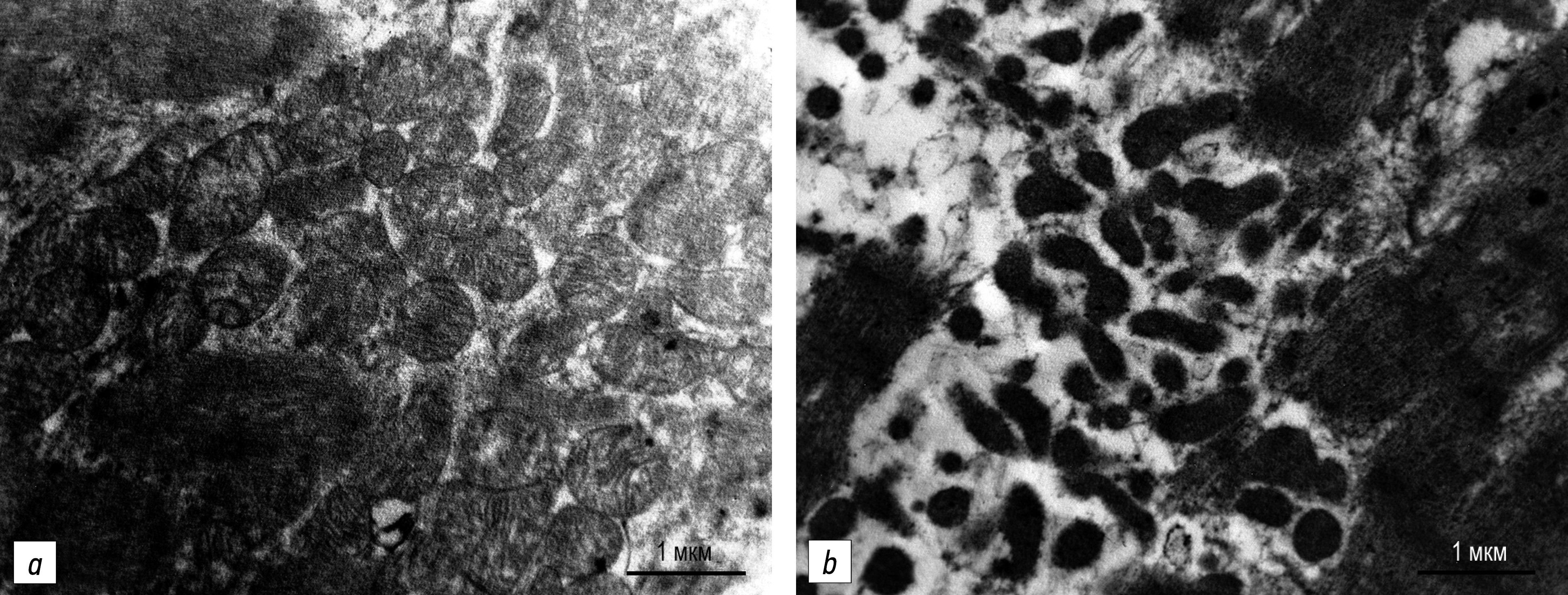 Рис. 1. Структурные изменения митохондрий кардиомиоцитов при гипертрофической кардиомиопатии и «рабочей» гипертрофии миокарда при аортальном стенозе: a — крупные митохондрии с электронно-прозрачным матриксом и нормальной ориентацией крист у пациента с «рабочей» гипертрофией миокарда; b — мелкие, полиморфные, выраженно гиперхромные митохондрии с повышенной плотностью упаковки крист в миокарде пациента с гипертрофической кардиомиопатией. Трансмиссионная электронная микроскопия, ×20 000.