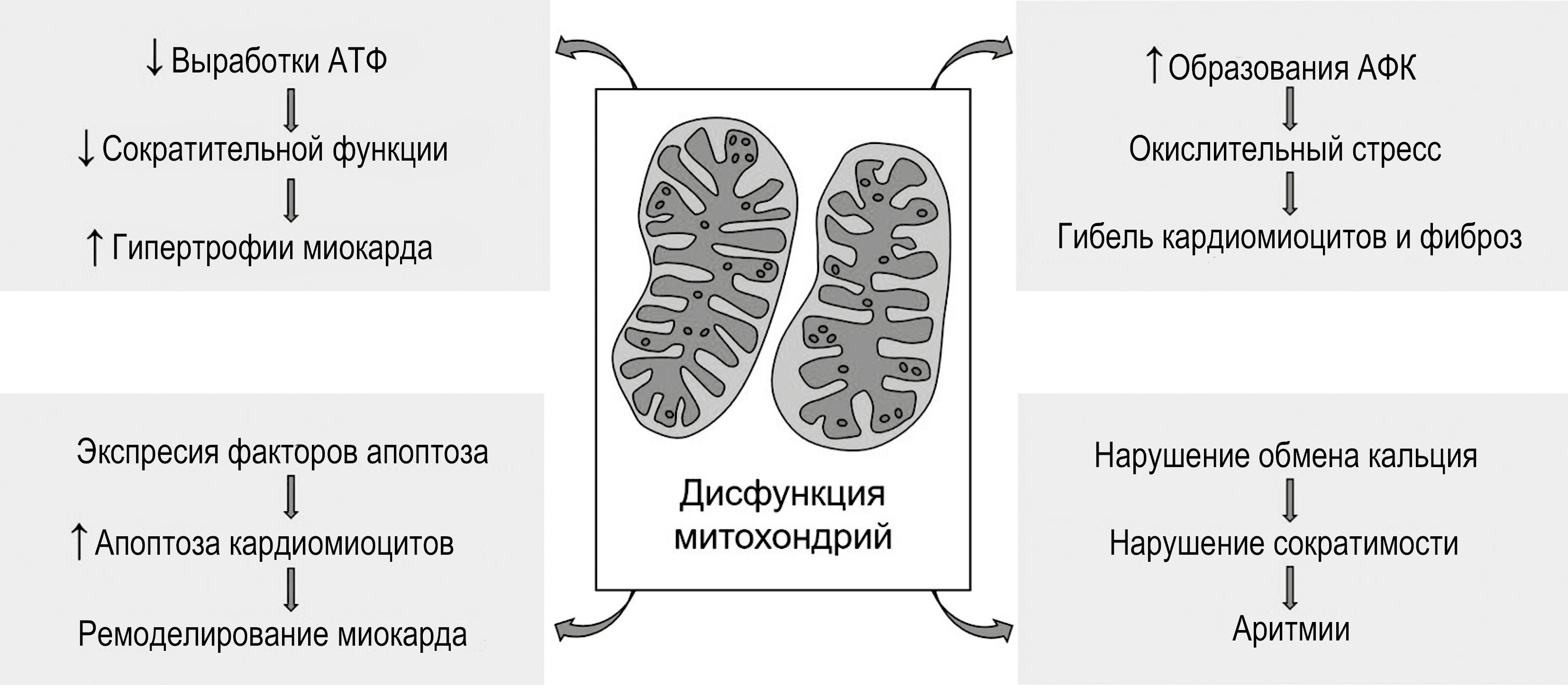 Митохондрии выполняют важную роль в развитии ГКМП посредством участия в производстве энергии, активных форм кислорода (АФК) и в депонировании кальция [9]. Способность митохондрий депонировать кальций необходима для реализации сокращения миокарда в норме, и нарушение его гомеостаза является одной из причин митохондриальной дисфункции [10]. За счёт непрерывных сокращений кардиомиоциты имеют высокие энергетические потребности, и нарушения выработки аденозинтрифосфата (АТФ) сказываются на функции сердечного сокращения. Дисфункция митохондрий отражается и на чрезмерном образовании АФК, основная доля которых, как известно, генерируется в процессе окислительного фосфорилирования. Высокие концентрации АФК могут приводить к окислительному стрессу и повреждению ДНК. При ГКМП повышенный окислительный стресс из-за дисфункциональных митохондрий может способствовать гибели клеток, гипертрофии миокарда и фиброзу [11]. При нарушениях работы митохондрии могут выделять проапоптотические факторы — такие как белки Bcl-2 (Bax, Bak), белок APAF-1, цитохром C, прокаспазы, белок AIF, которые запускают апоптотические каскады и способствуют потере кардиомиоцитов при ГКМП. Гибель кардиомиоцитов может ещё больше усугубить ремоделирование миокарда и дисфункцию гипертрофированного сердца.