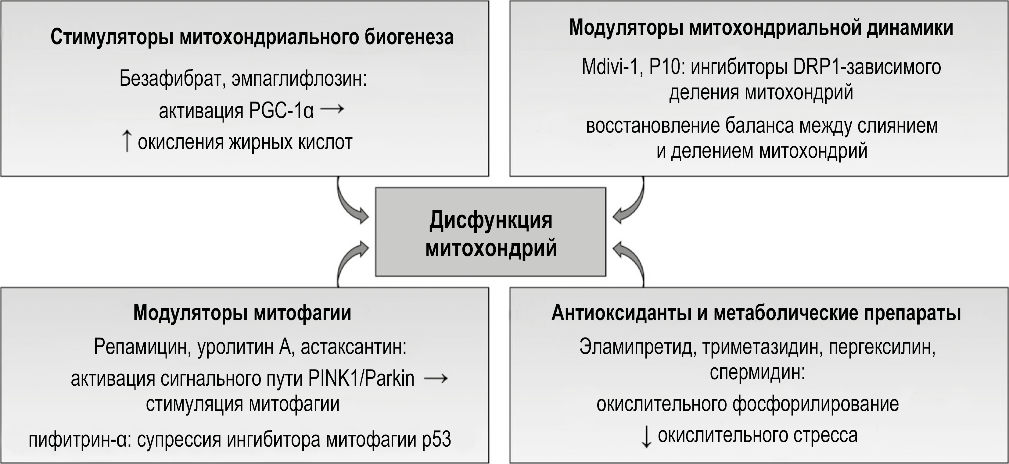 Стимуляторы митохондриального биогенеза. Активация процесса образования новых митохондрий может помочь улучшить их функцию и производство АТФ в кардиомиоцитах. В частности, PGC-1α — 1α-коактиватор гамма-рецептора, активирующего пролиферацию пероксисом, стимулирует биогенез митохондрий путём регуляции генов, участвующих в окислении жирных кислот и окислительном фосфорилировании. Одним из таких активаторов является безафибрат* — гиполипидемический препарат, который показал эффективность при мышечной атрофии и энцефалопатии у мышей, а также на крысиных моделях нейродегенеративных заболеваний за счёт митохондриальной протекции [73–75]. Проводились и клинические исследования безафибрата при хронической болезни почек и дефиците трифункционального белка [76, 77]. Среди активаторов PGC-1α функцию митохондрий также улучшают уролитин А* и эмпаглифлозин* [78].