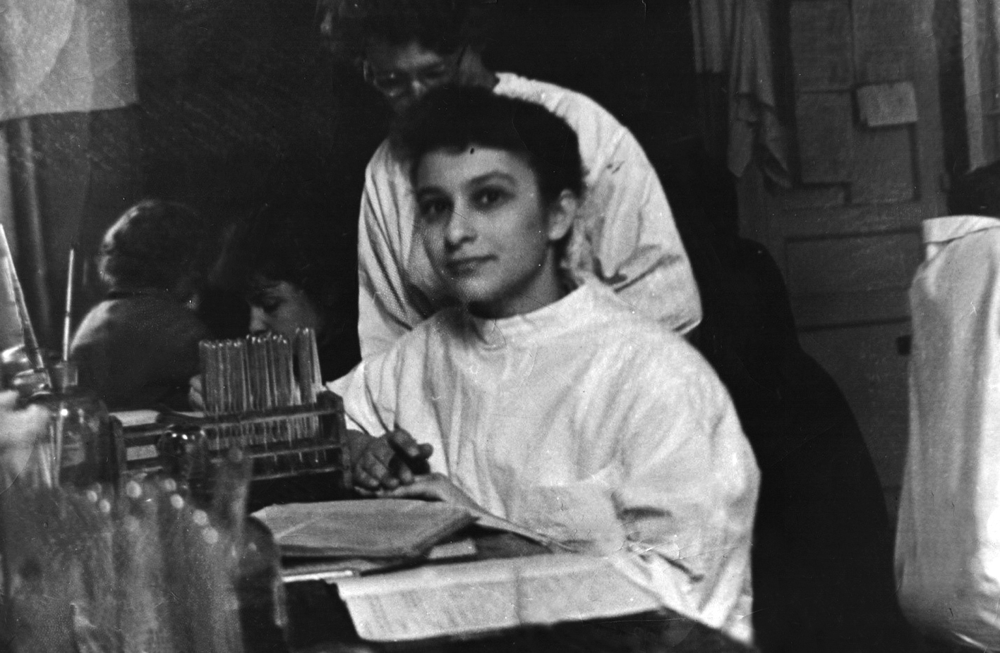 Рис. 1. Студентка Ленинградского педиатрического медицинского института Наталья Карелина на занятии по микробиологии, 1965 год.