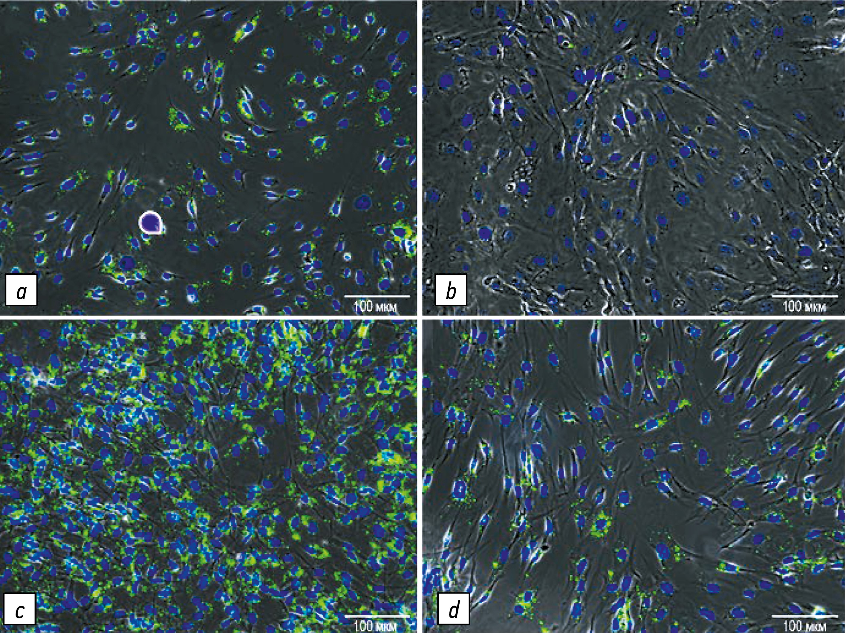 Рис. 1. Клеточные линии после инкубации с латексными частицами. Докраска ядер DAPI: a — первичные гладкомышечные клетки из tunica media; b — мезенхимные стволовые клетки ASC52telo; c — фибробласты 977hTERT; d — первичные клетки, выделенные из tunica adventitia. Масштабный отрезок — 100 мкм.