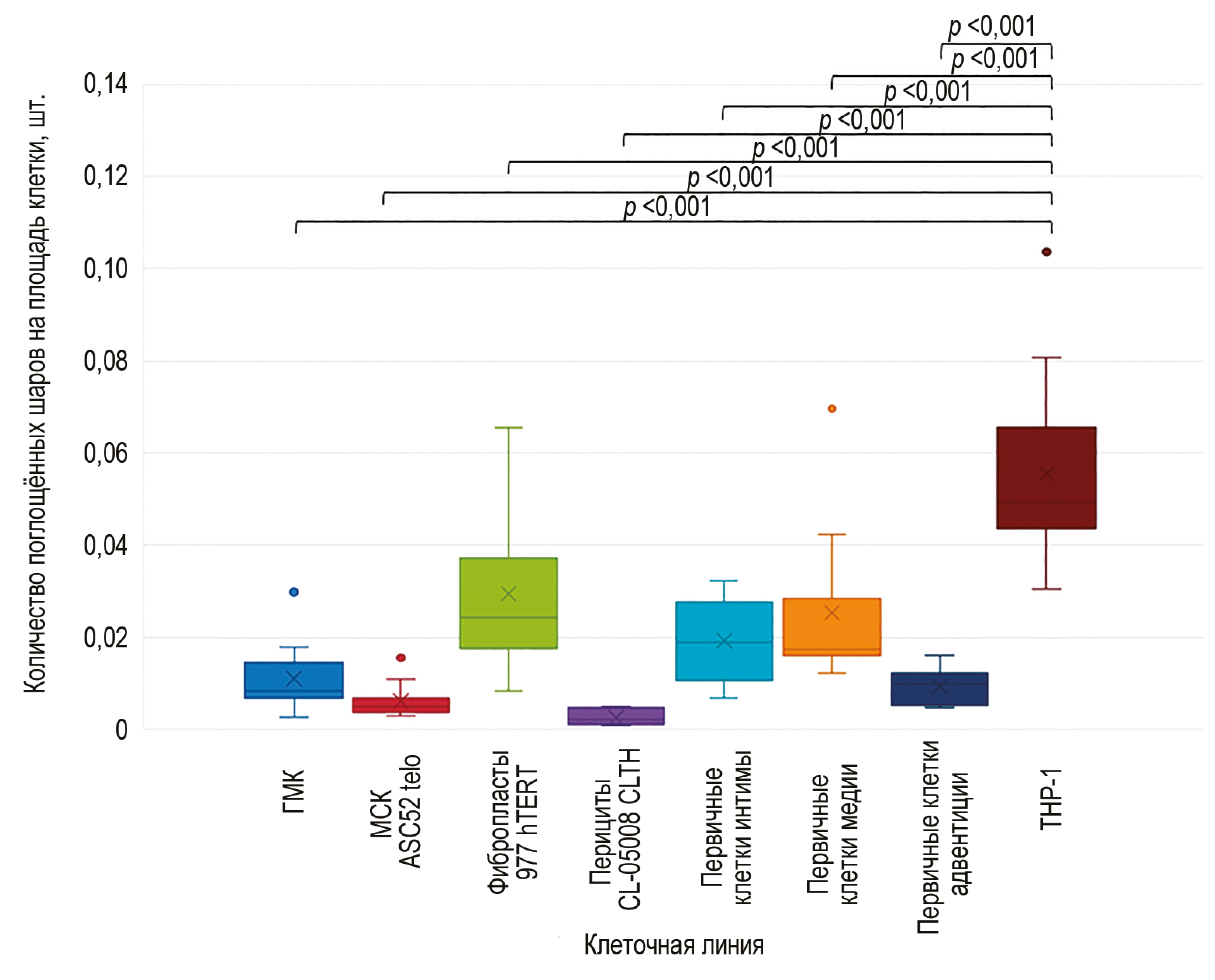 Статистический анализ фагоцитарной активности изучаемых клеточных линий показал, что среднее количество поглощённых латексных частиц в клетках на мкм2 составило: для ТНР-1 0,055±0,022 шт.; для ГМК от здоровых доноров 0,011±0,008 шт.; для мезенхимных стволовых клеток (МСК) 0,006±0,004 шт.; для фибробластов 0,029±0,019 шт.; для перицитов 0,003±0,002 шт.; для клеток, выделенных из интимы, 0,019±0,009 шт.; для клеток, выделенных из медии, 0,025±0,018 шт.; и для клеток, выделенных из адвентиции, 0,009±0,004 шт.