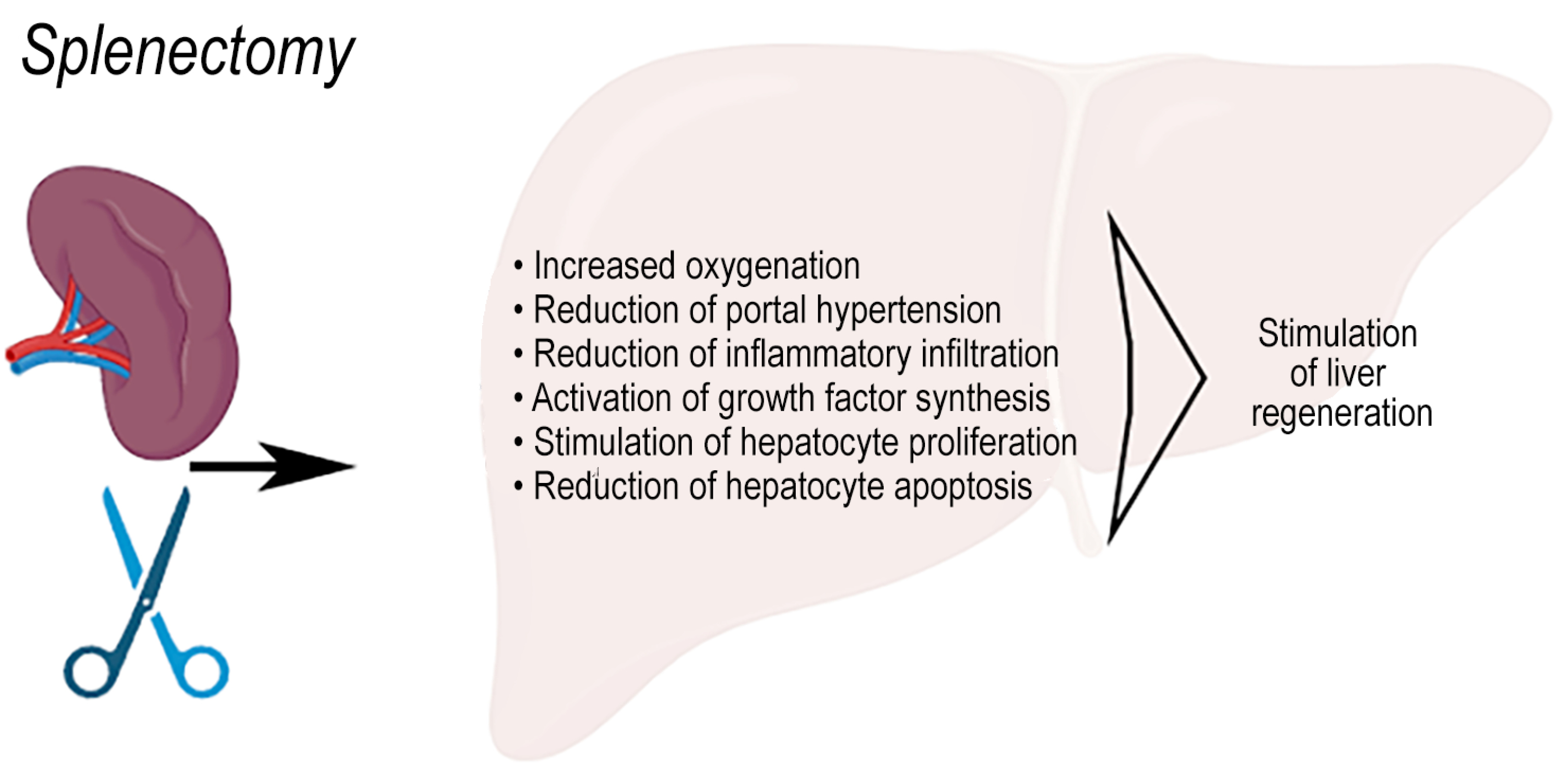 The positive effect of splenectomy has also been demonstrated in the case of liver transplantation in patients with biliary atresia [44]. It has been established that simultaneous splenectomy improves the prognosis of liver graft survival and prevents the development of small-for-size remnant liver syndrome [45]. It has been revealed that splenectomy can lead to a decrease in portal hypertension, a decrease in the synthesis of proinflammatory cytokines and the level of cell apoptosis in the transplanted liver [46, 47]. The decrease in blood pressure in the portal vein is based on a decrease in the synthesis of endothelin-1, which is a key molecule in microcirculation disorders, since it causes narrowing of the liver sinusoids [48]. In the study by T. Matsuura et al., 15.8% of patients who underwent liver transplantation suffered from persistent thrombocytopenia and splenomegaly for seven years [49]. However, splenectomy resulted not only in regression of pancytopenia, but also in improvement of liver function [44]. Other studies also noted the key importance of portal vein pressure [50–52]. In contrast, C. Eipel et al. revealed that the beneficial effect of splenectomy in small liver lobe syndrome may be due to an increase in hepatic arterial blood flow with increased oxygen delivery, rather than a decrease in portal vein hyperperfusion into the liver remnant [39]. Improved oxygenation probably stimulates hepatocyte proliferation [34, 35].
