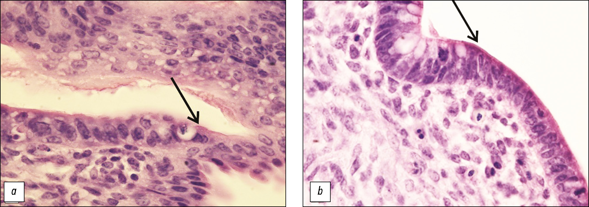 Рис. 2. Клоака куриного эмбриона на 13-е сутки развития — зоны взаимодействия эпителиев (указаны стрелками): a — эпителий кожной и мочевой части клоаки; b — эпителий мочевой и кишечной части клоаки. Окраска гематоксилином и эозином, увеличение ×400.