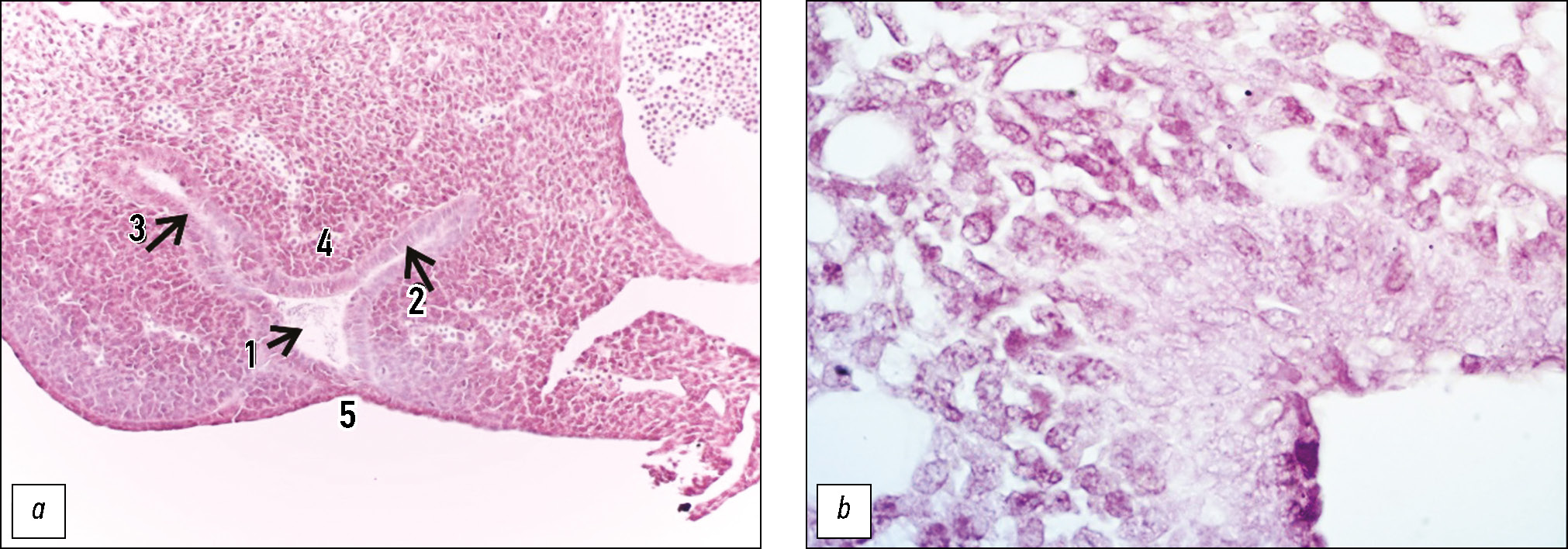 Рис. 3. Клоака эмбриона крысы на 9-е сутки развития: a — разделение клоаки, 1 — клоака, 2 — мочеполовой синус, 3 — аноректум, 4 — уроректальная складка, 5 — клоакальная перепонка. Окраска гематоксилином и эозином, увеличение ×200; b — клоакальная перепонка. Окраска гематоксилином и эозином, увеличение ×1000 (иммерсия).