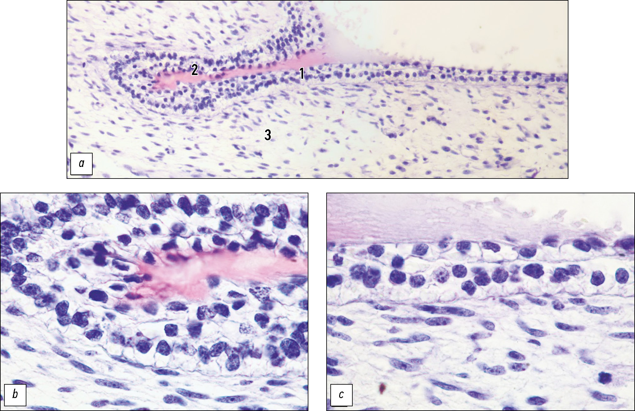 Рис. 6. Анальная инвагинация эмбриона человека на 7-й неделе внутриутробного развития: a — строение, 1 — базальный слой, 2 — оксифильная плёнка, заполняющая просвет, 3 — соединительная ткань; b, c — гетероморфия эпителиоцитов в разных участках анальной инвагинации. Окраска гематоксилином и эозином, увеличение ×1000 (иммерсия).