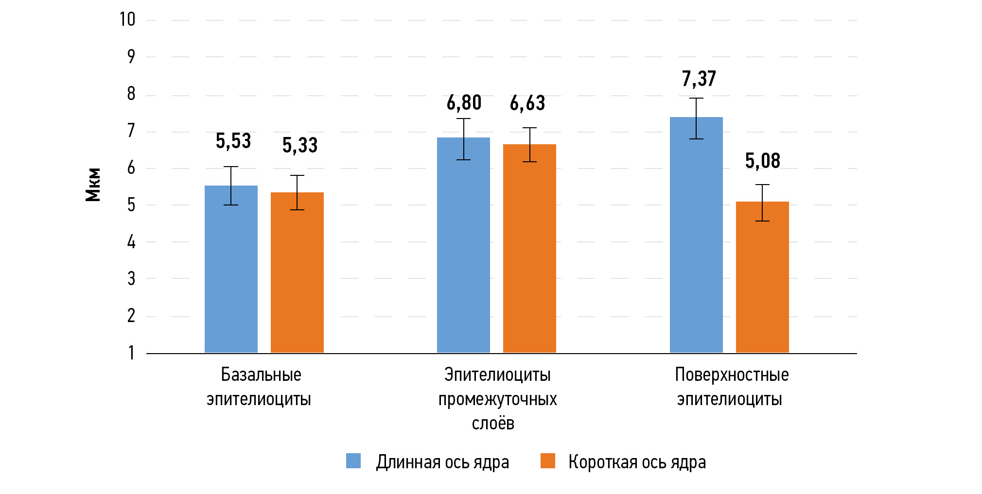 Рис. 8. Кариометрическая характеристика эпителия глубокого (донного) участка анальной инвагинации эмбриона человека на 7–8 неделе развития. Данные представлены в микрометрах, в виде среднего арифметического значения и стандартной ошибки среднего.