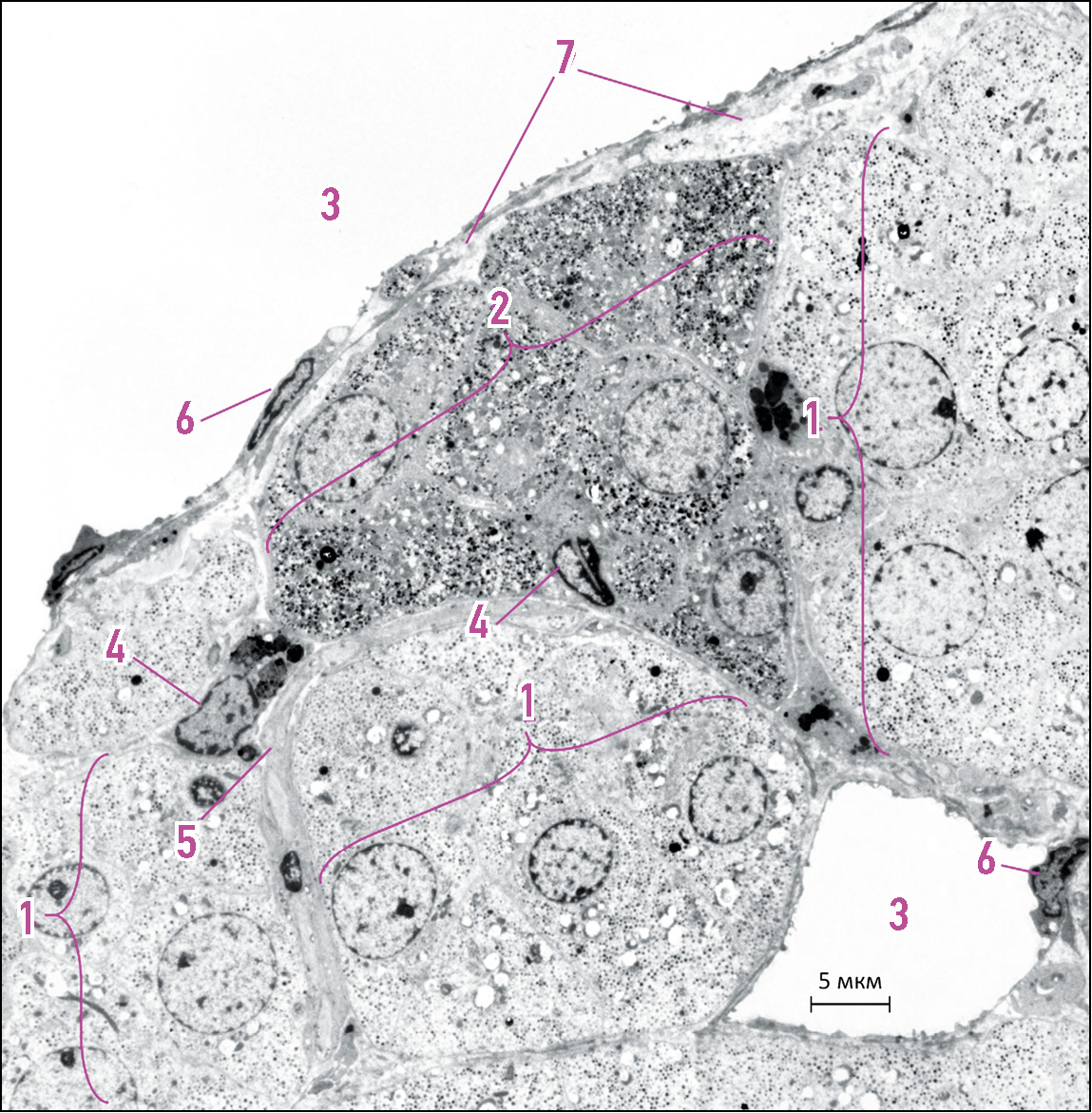 Fig. 3. Adrenal medulla of a newborn rat: 1, clusters of electron-lucent (light) chromaffinoblasts; 2, capillary; 3, erythrocytes; 4, fibroblasts; 5, cortical cells; 6, degenerating cortical cell; 7, venous sinus. Transmission electron microscopy. © Eco-Vector, 2024.