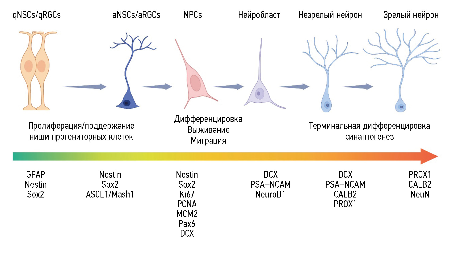 Рис. 2. Этапы нейрогенеза во взрослом мозге грызунов и человека. Покоящиеся стволовые нейроэпителиальные клетки и клетки радиальной глии (qNSCs/qRGCs) под воздействием сигналов от микроокружения активируются (aNSCs/aRGCs) и возобновляют асимметричное деление. При постнатальном нейрогенезе новые нейроны не образуются напрямую из клеток радиальной глии (RGCs), что отличает его от эмбрионального нейрогенеза. Происходит последовательная дифференцировка в нейрональные клетки-предшественники (NPCs), нейробласты, незрелые и дифференцированные нейроны, которые функционально активны и способны встраиваться в существующую нейронную сеть. В нижней части рисунка, под стрелкой, обозначены основные гены, экспрессирующиеся на разных стадиях дифференцировки клеток при нейрогенезе.