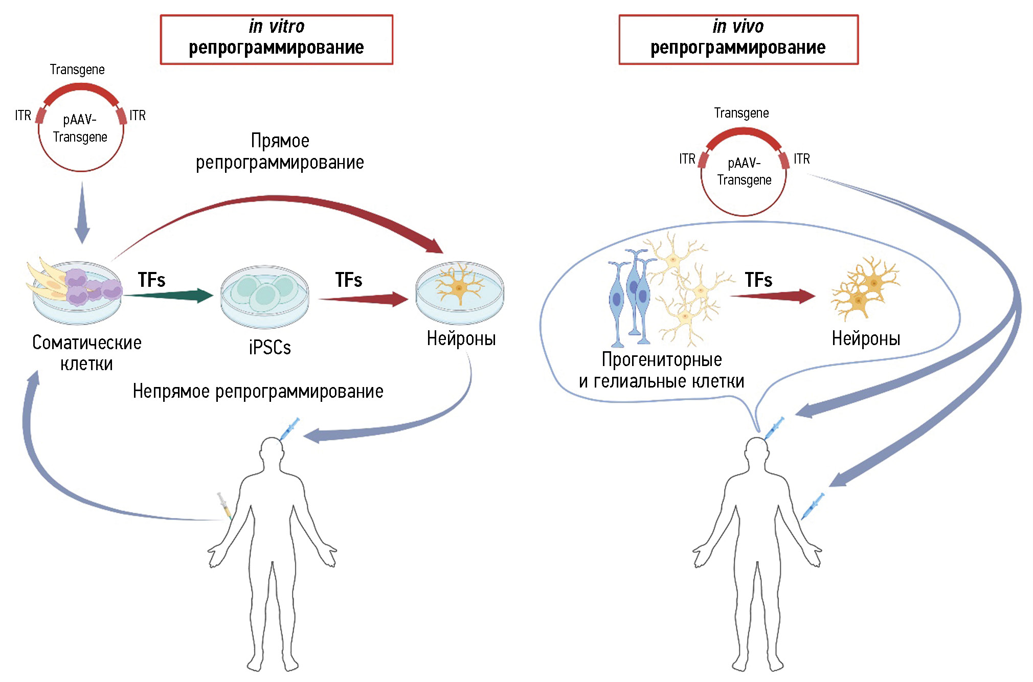 Рис. 3. Схематичное изображение клеточного репрограммирования в условиях in vitro и in vivo: TFs — факторы транскрипции (Transcription factors); pAAV-transgene — вирусный вектор с тaргетными генами; iPSCs — индуцированные плюрипотентные клетки.