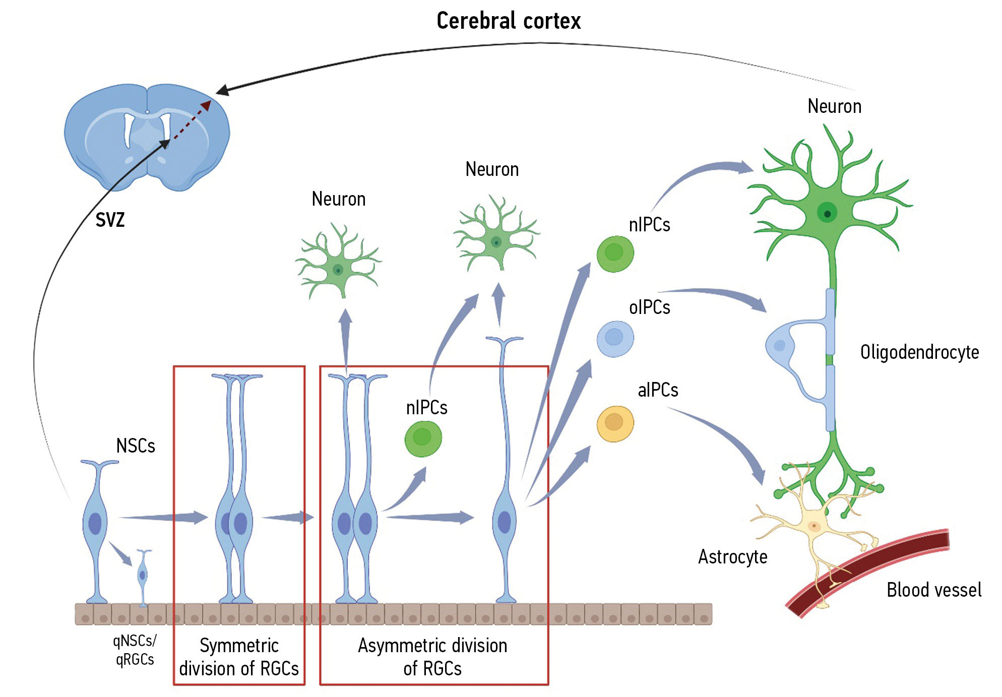 Рис. 1. Схема эмбрионального развития головного мозга. Стволовые нейроэпителиальные клетки (NSCs) в субвентрикулярной зоне (SVZ) делятся симметрично и формируют пул клеток радиальной глии (RGCs). В результате симметричного и асимметричного деления RGCs образуются промежуточные клетки-предшественники — нейрональные (Neuronal intermediate progenitor cells, nIPCs), олигодендроцитарные (Oligodendrocyte intermediate progenitor cells, oIPCs) и астроцитарные (Astrocyte intermediate progenitor cells, aIPCs). По мере дифференцировки клетки мигрируют из нейрогенной области SVZ, формируют гистоархитектонику неокортекса (обозначено красной пунктирной стрелкой) и становятся зрелыми нейронами, олигодендроцитами и астроцитами. На самых ранних этапах эмбриогенеза формируется ниша покоящихся NSCs и RGCs (Quiescent NSCs/RGCs, qNSCs/qRGCs), за счёт которых происходит нейрогенез во взрослом головном мозге.