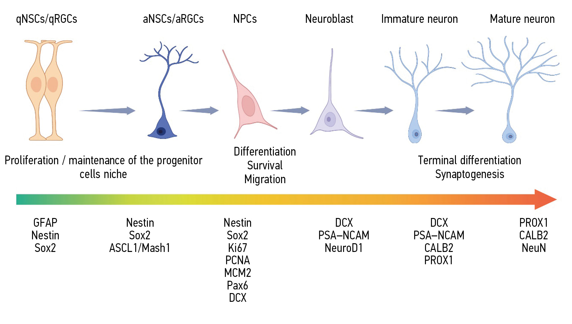 Fig. 2. Stages of neurogenesis in the adult brain of rodents and humans. Quiescent neural stem cells and radial glial cells (qNSCs/ qRGCs) become activated (aNSCs/aRGCs) in response to microenvironmental signals and resume asymmetric division. Unlike embryonic neurogenesis, postnatal neurogenesis does not involve the direct generation of new neurons from radial glial cells (RGCs). Instead, a sequential differentiation process occurs, giving rise to neuronal progenitor cells (NPCs), neuroblasts, immature neurons, and finally, functionally active, mature neurons that integrate into the existing neuronal network. The lower part of the figure (below the arrow) indicates key genes expressed at different stages of cell differentiation during neurogenesis.