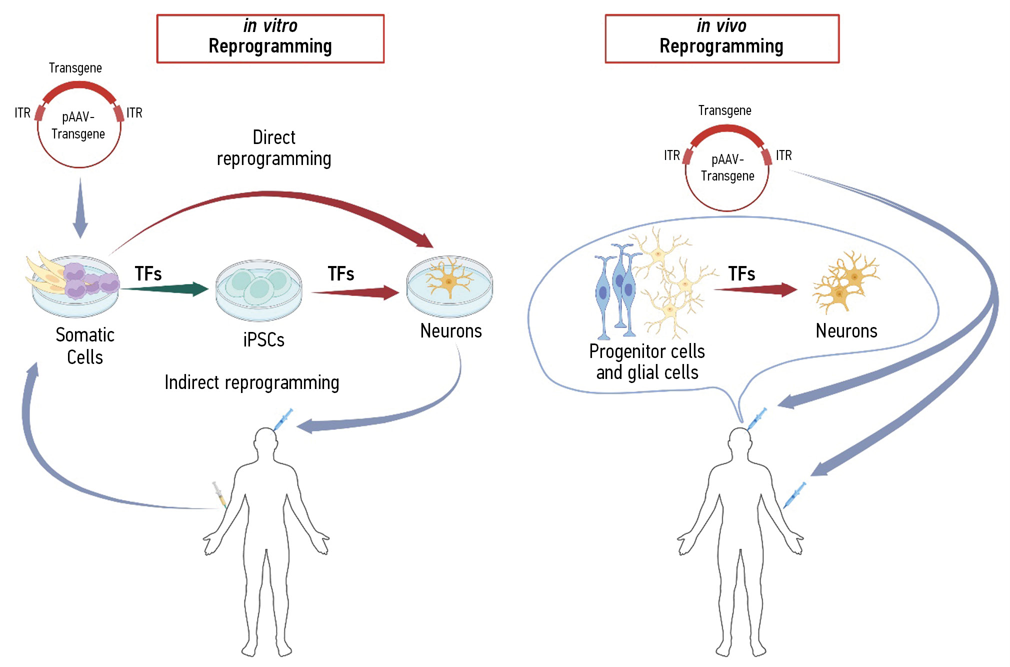 Fig. 3. Schematic representation of cellular reprogramming in vitro and in vivo: TFs, transcription factors; pAAV-transgene, viral vector carrying target genes; iPSCs, induced pluripotent stem cells.