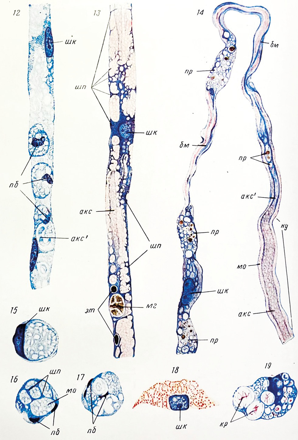 Fig. 3. Drawings from scientific paper by B.S. Doynikov — сross-section through the peripheral portion of the transected sciatic nerve of a rabbit 6 weeks after injury: шт — plasma Schwann bands; энд — endoneurium; фб — fibroblast filled with fat droplets; пс — vessel lumen; овз — cross-section of ovoid swellings of vesicular cells; пн — perineurium, elements of which contain a large number of lipoid inclusions. Sudan III staining. Adapted from [6]. © Doynikov BS, 1955.