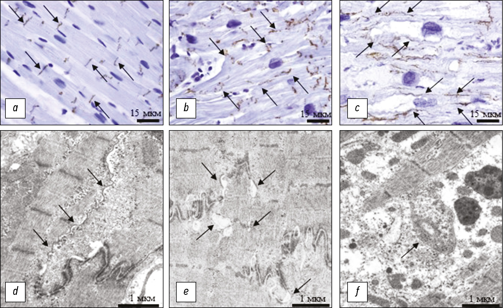Fig. 1. Gap junctions in cardiomyocytes of the interventricular septum of patients with hypertrophic cardiomyopathy: a — Cx43+-gap junctions in the intercalated discs of the cardiomyocytes. Control group. A 54-year-old patient; b — polygonal cardiomyocytes. Multiple additional intercalated discs containing Cx43+-gap junctions on the lateral surfaces of the cardiomyocytes. A 27-year-old patient with hypertrophic cardiomyopathy; c — cardiomyocytes with pronounced loss of myofibrils. Cx43+-gap junctions (arrows) are diffusely located over the entire surface of the cardiomyocytes. A 44-year-old patient with hypertrophic cardiomyopathy; d — gap junction (arrows) on the longitudinal section of the intercalated disc of the cardiomyocytes. A 58-year-old patient with hypertrophic cardiomyopathy; e — areas of local divergence of longitudinal parts of the intercalated disc of the cardiomyocytes (arrows). A 59-year-old patient with hypertrophic cardiomyopathy; f — annular areas of membrane invaginations on the lateral surfaces of the myocyte containing gap junctions (arrow), lipofuscin granules. A 39-year-old patient with hypertrophic cardiomyopathy. a–c — immunoperoxidase reaction, antibodies to Cx43; d–f — electron micrographs.